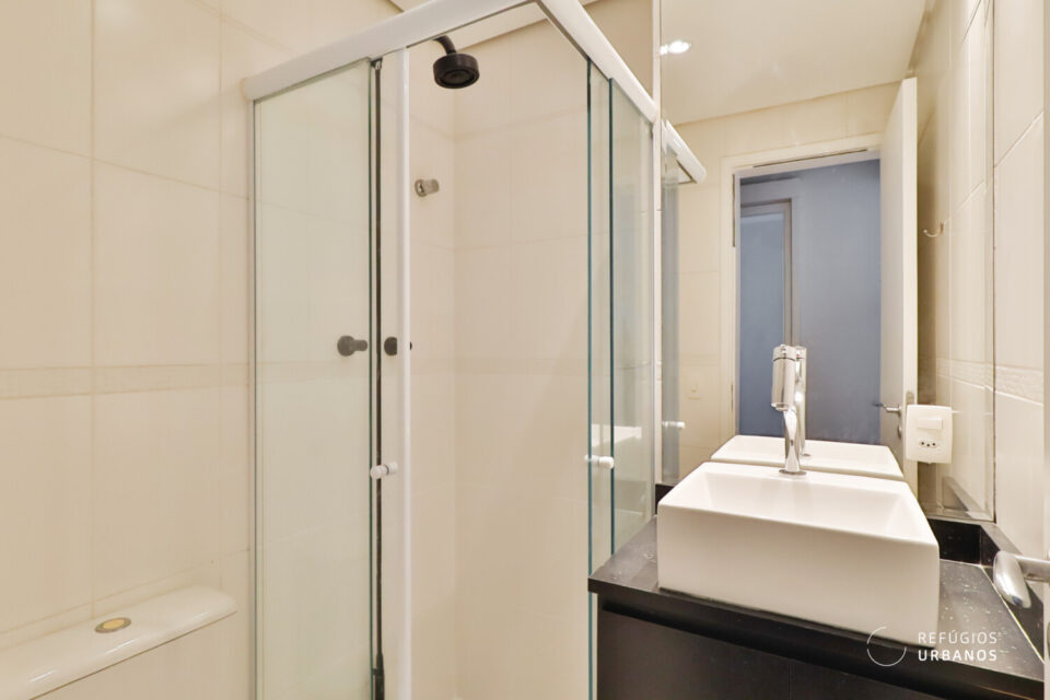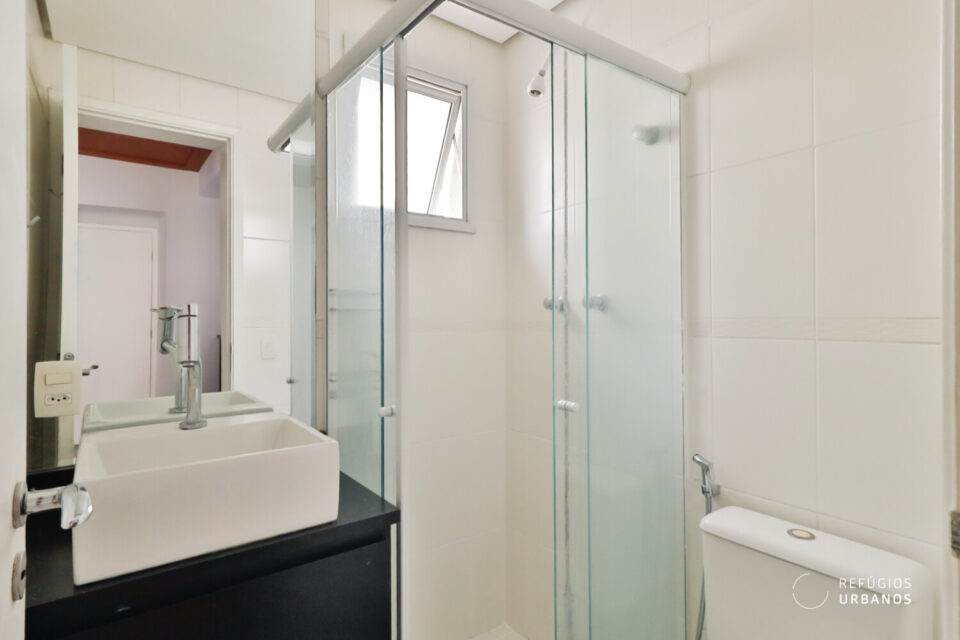 O banheiro social, localizado no corredor, é completo e funcional, atendendo perfeitamente ao segundo dormitório e às visitas.