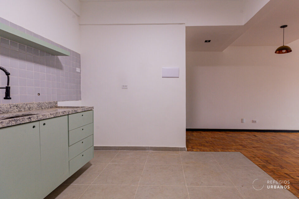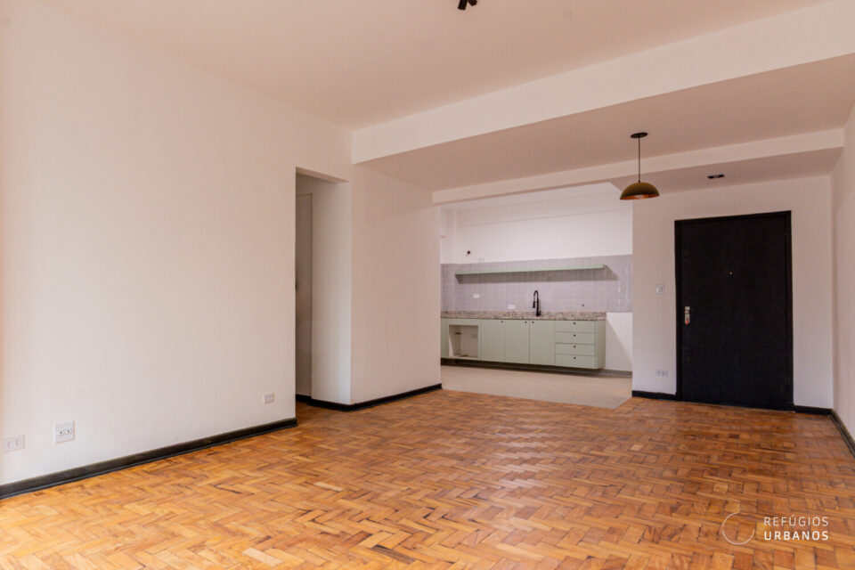 São  90 m² de área útil muito bem distribuídos. Logo na entrada, você se depara com a sala de jantar e estar, que se integram à cozinha. Esses ambientes conversam por meio do piso de tacos em madeira, restaurado na reforma. Além disso, a vista para a copa das árvores é simplesmente incrível. Vale ressaltar que a cozinha está equipada com marcenaria.