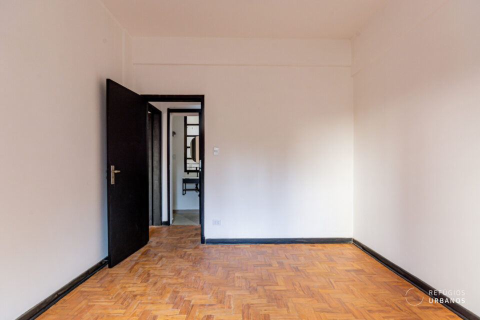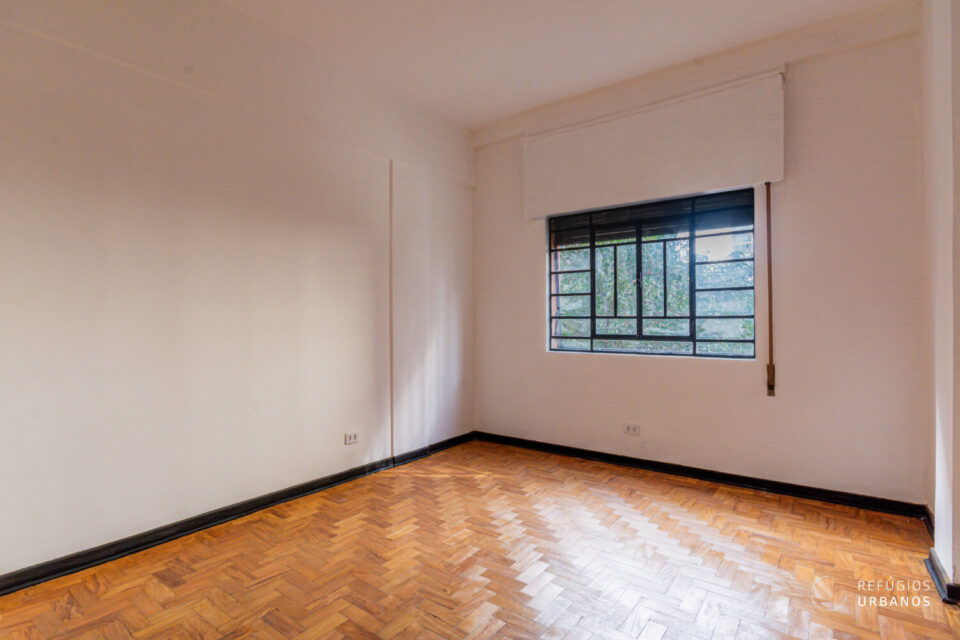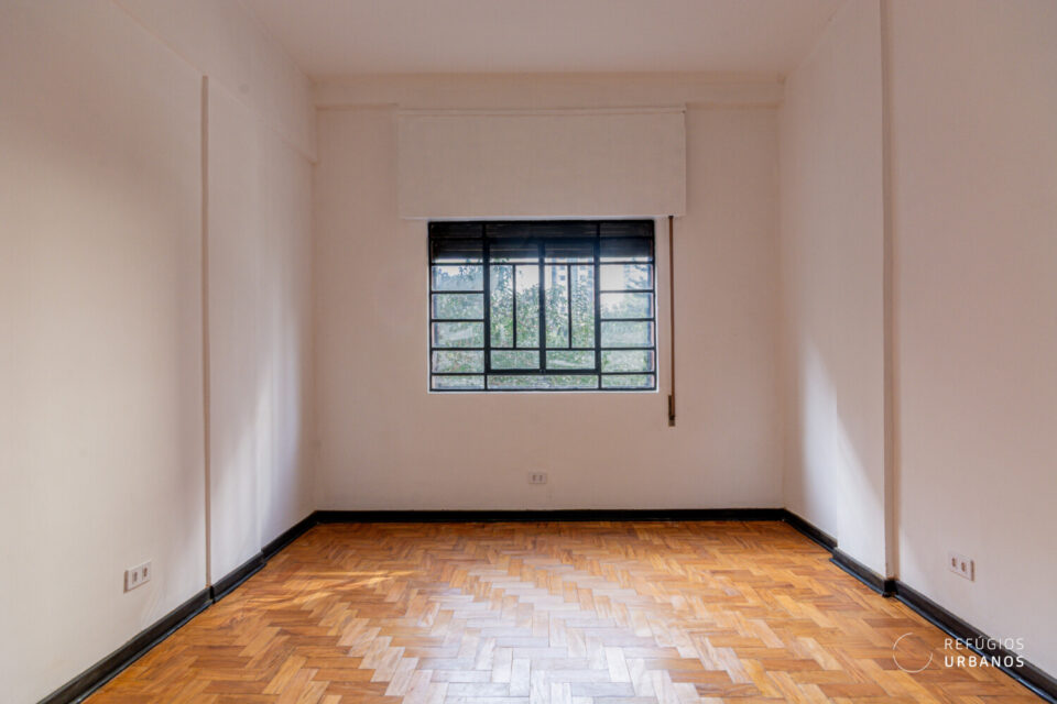 Um corredor nos leva até a área íntima, na qual temos dois quartos, sendo um deles uma suíte. Ambos com piso em tacos de madeira, e assim como a sala, o ponto que nos chama a atenção é a vista acolhedora que temos para a copas das árvores. Somado a isso, vale destacar que também temos um banheiro completo nessa área.