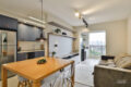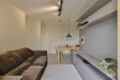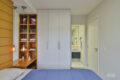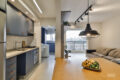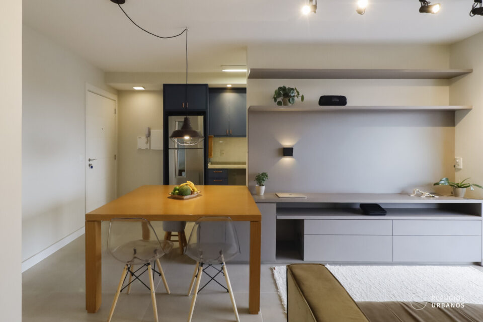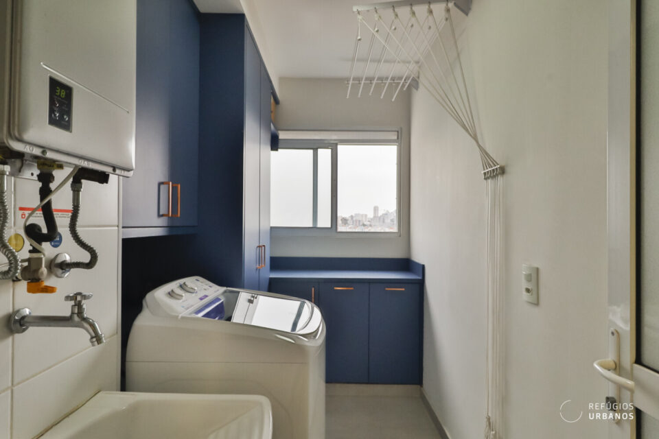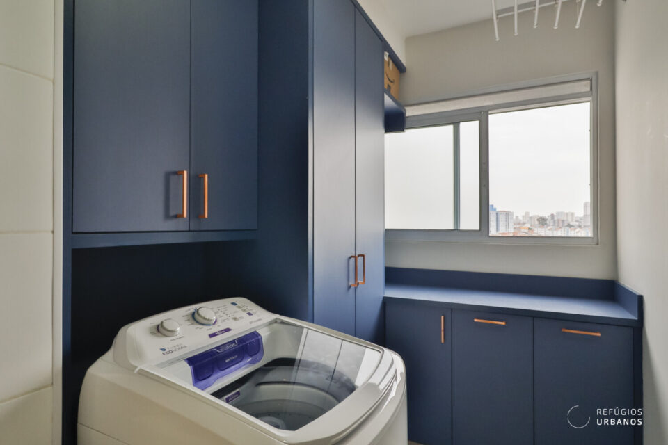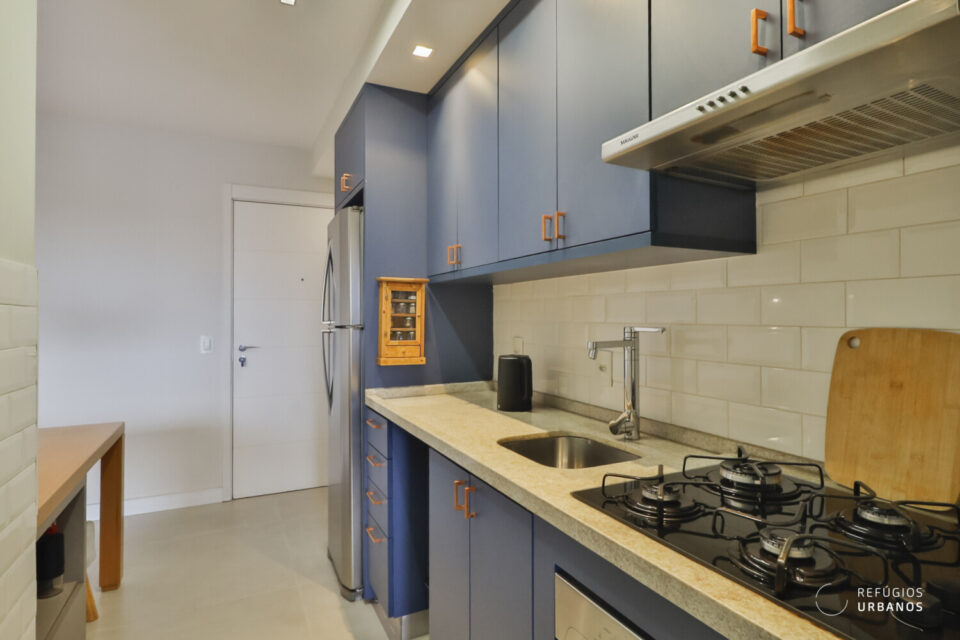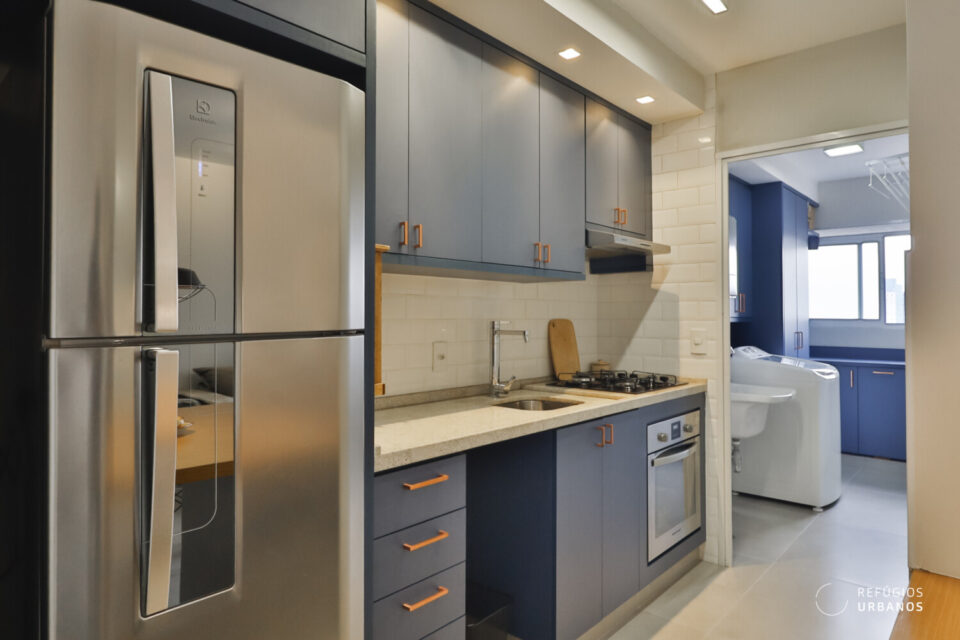 Além disso, a sala também foi semi-integrada à cozinha. A marcenaria em tom de azul chama a atenção de longe, e com certeza não merece ficar escondida. Assim como na varanda e na sala, temos aqui a mesma ideia de continuidade, onde a área de serviço se torna a extensão da cozinha, também com marcenaria azulada e bastantes armários.