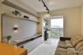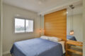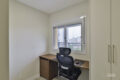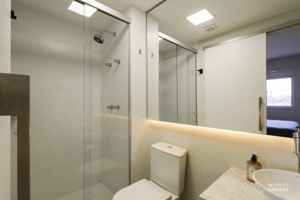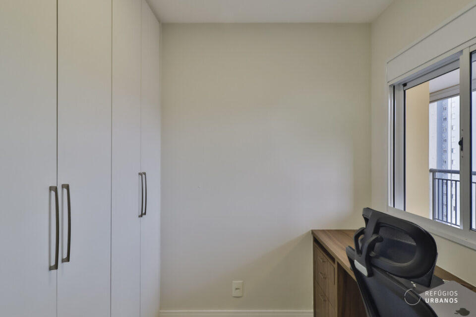 Logo depois, um corredor nos leva à área íntima, onde temos o primeiro dormitório, e que hoje se tornou um home office. Ainda sim, manteve o guarda-roupa embutido, podendo facilmente voltar a ser um quarto. Temos também um banheiro completo, que atende às visitas e ao segundo dormitório. A suíte, além de ser mais ampla, também possui armários embutidos tanto no quarto, como no banheiro.