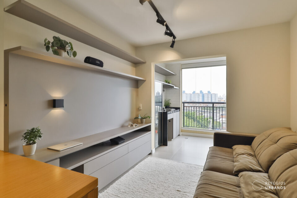 Ao entrarmos na sala, a marcenaria impecável do ambiente e da varanda gourmet chama a atenção. Aliás, os dois ambientes foram integrados, dando não apenas uma maior amplitude ao espaço, mas também uma sensação de continuidade, com a marcenaria igual nos dois cômodos.