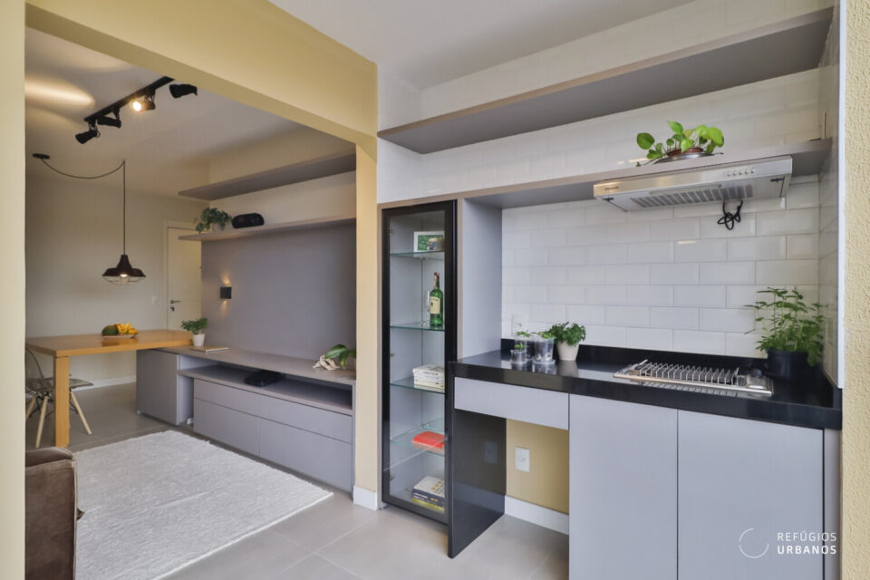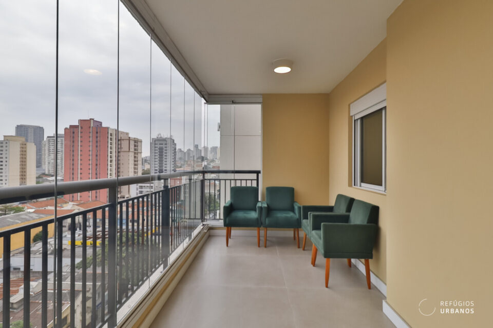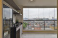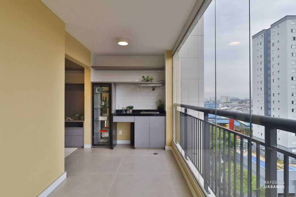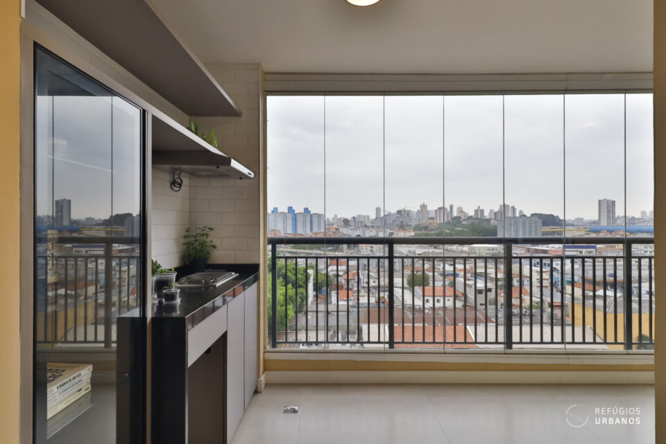 Falando em varanda, este é um dos ambientes mais gostosos do apê. Aqui fica a churrasqueira, e ainda um espaço super agradável para um fim de tarde. A vista livre para o bairro é um bônus mais do que especial!