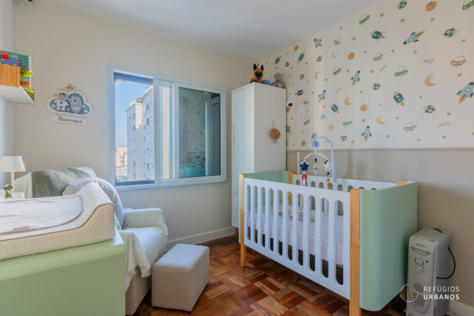 Na área íntima, os dois dormitórios têm janelas antirruído – colocadas para a chegada do bebê – além de guarda roupas novinhos. E por fim, no corredor há uma sapateira que ajuda no gerenciamento de espaço.