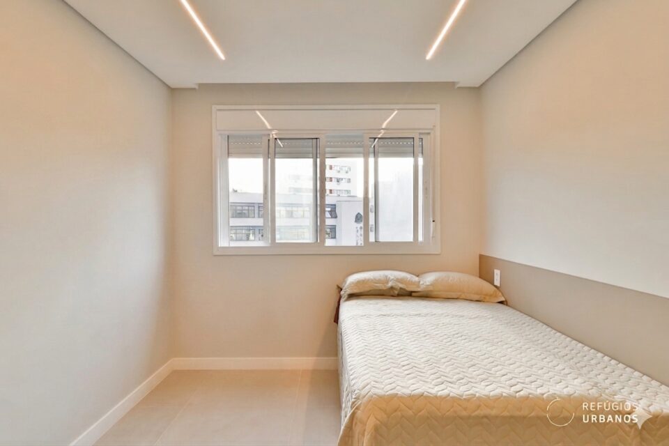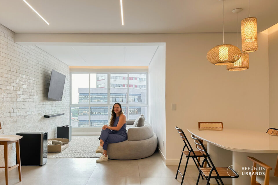 O grande destaque do apartamento fica logo na sala: um janelão generoso que enquadra a paisagem urbana como se fosse uma arte em movimento. Com luz natural em abundância e amplitude visual de sobra, os olhos ainda conseguem apreciar a bela Paróquia Nossa Senhora da Lapa, um presente para quem chega em casa.