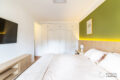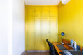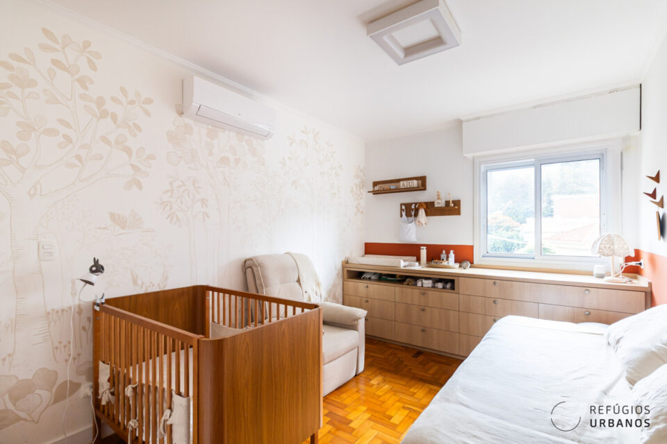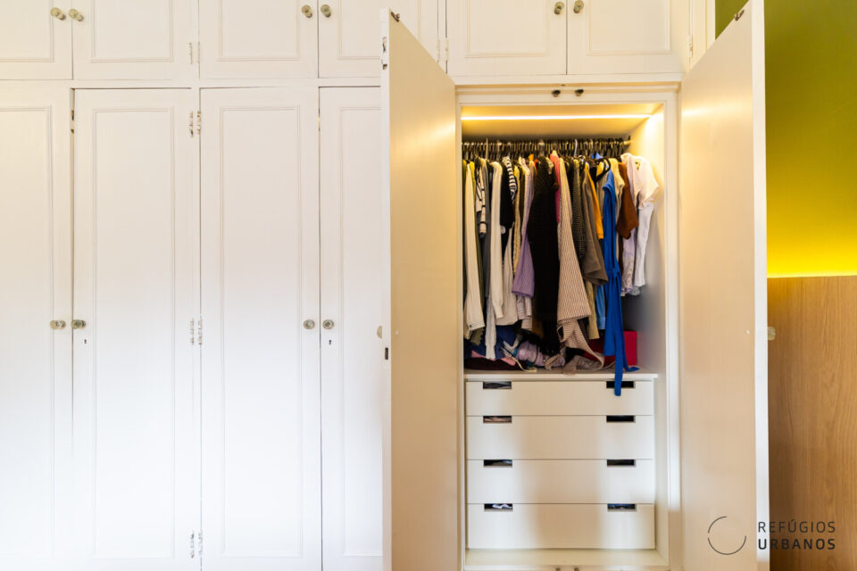 Na área íntima os dois quartos têm pé direito generoso, armários com portas restauradas e interior novo.