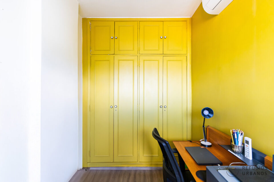 Há ainda boas surpresas. Um escritório com marcenaria fica após a lavandeira, onde o antigo banheiro de apoio deu lugar para uma despensa funcional. Ou seja, uma deliciosa área de home office e armazenamento garantido.