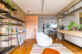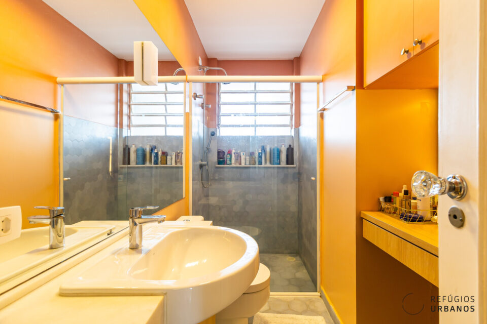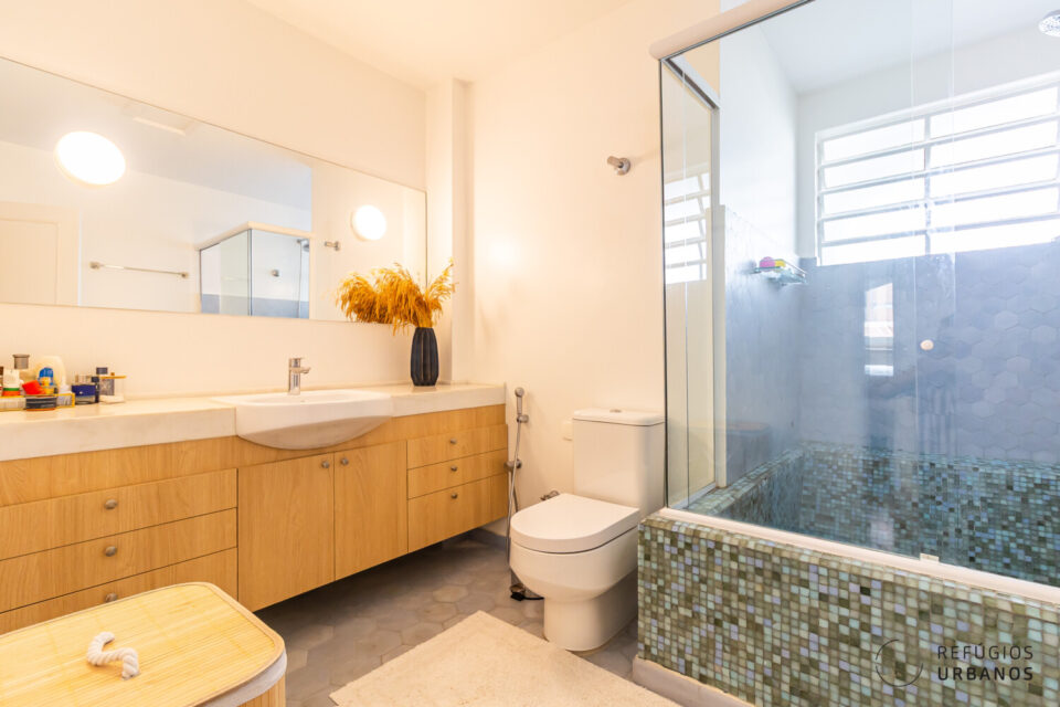 Uma pequena varanda deixa a suíte ainda mais charmosa e garanto que há espaço para uma cama super king. Os banheiros estão também totalmente renovados, com ventilação natural e chuveiro a gás. O banheiro social completo é grande o suficiente para uma banheira, que ganhou revestimento de pastilhas coloridas.
