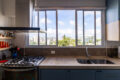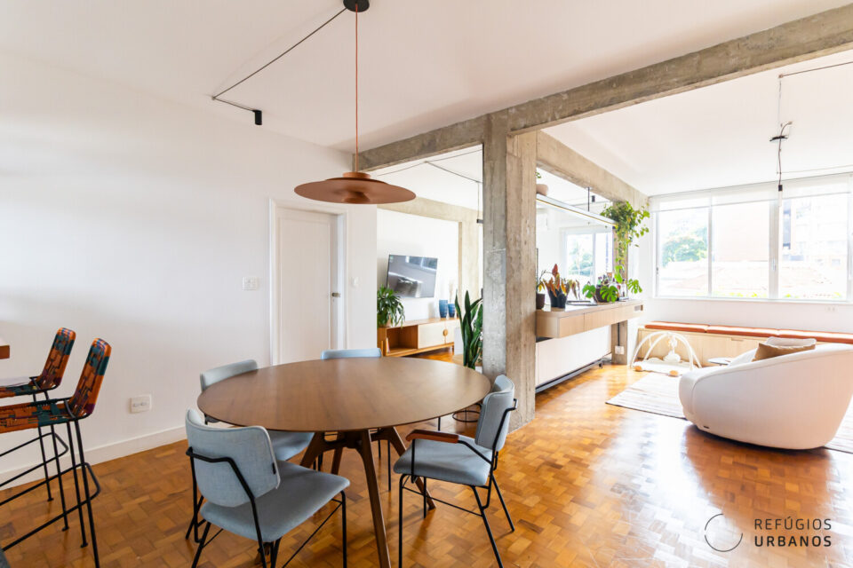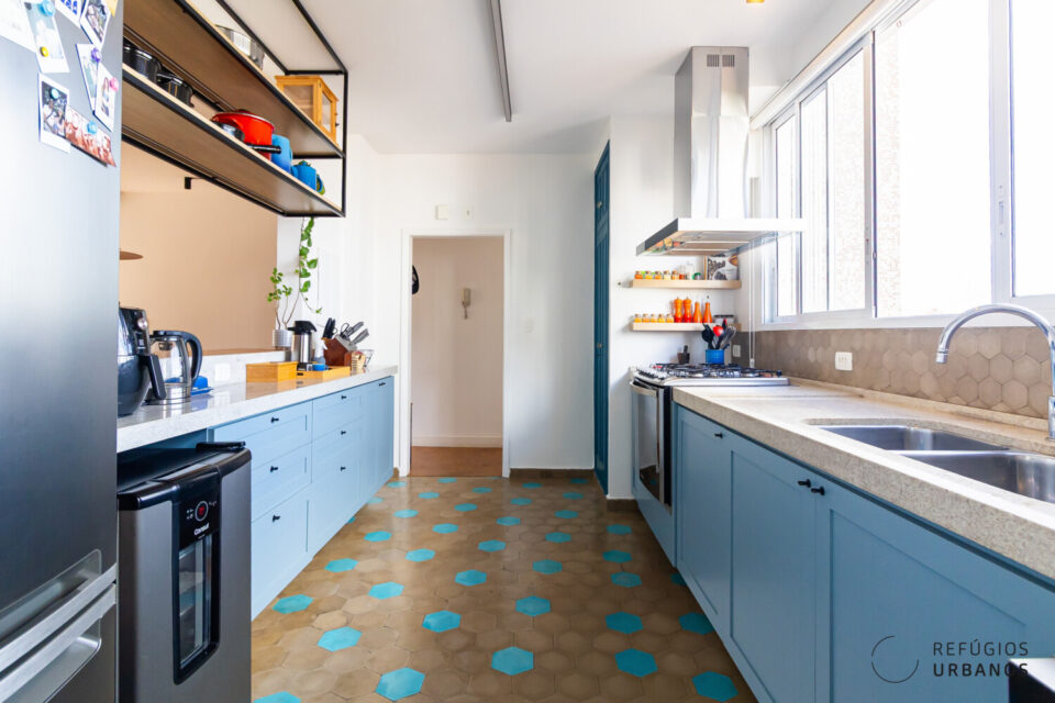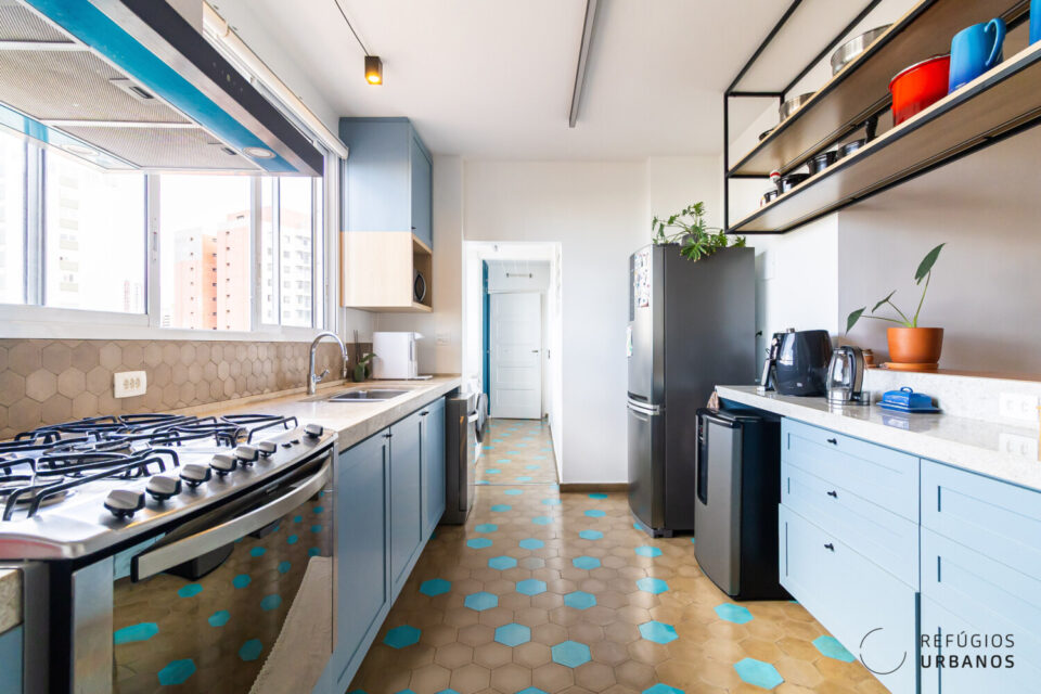 Com a abertura parcial da cozinha para o living, o imóvel ganhou ventilação cruzada, mais integração e uma bela luz do final da tarde. Isso porque a cozinha tem grandes janelas de onde se enxerga o por do sol.