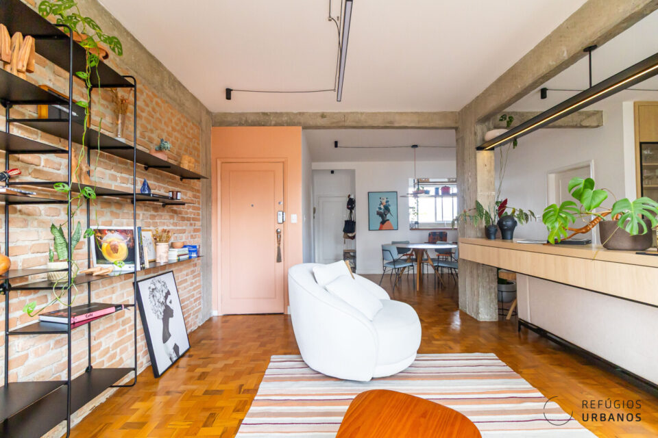 O piso de taco, tijolinho e concreto aparentes, estante em serralheria sob medida: muitos elementos misturam o antigo e contemporâneo nessa reforma.