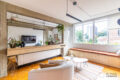 A planta original tem três dormitórios, mas aqui um dos quartos foi aberto para o living, criando um espaço ainda mais amplo de estar e convivência – algo que pode ser revertido.