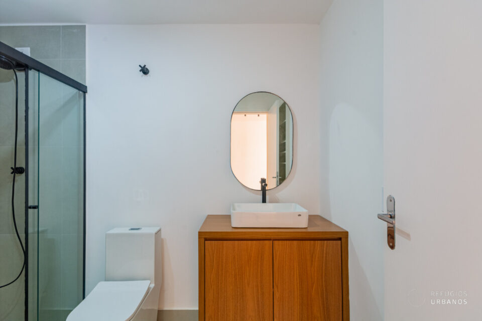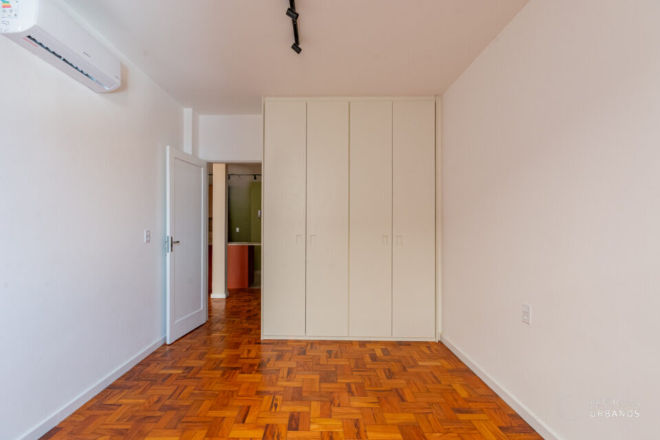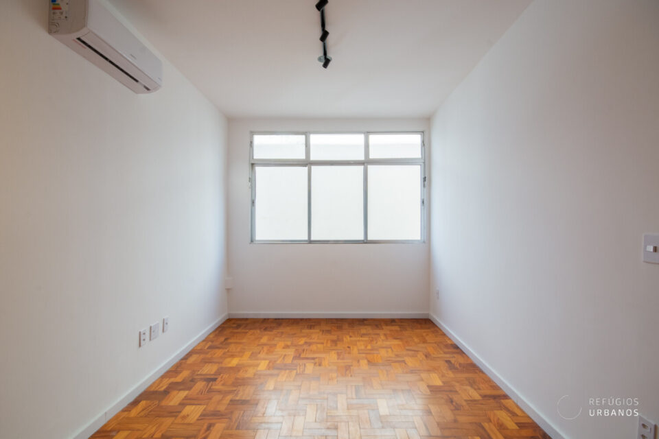 Na área íntima, temos um quarto espaçoso, com piso em tacos de madeira, e assim como na sala, para garantir ainda mais conforto, temos o ar-condicionado. Somado a isso, vale destacar que também contamos com um banheiro completo e com ventilação natural.