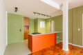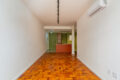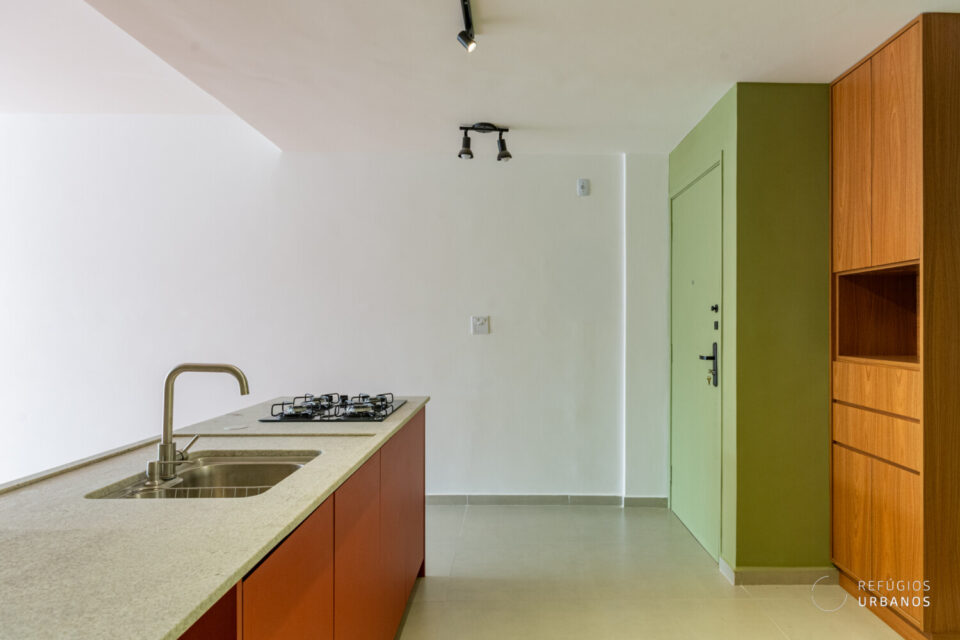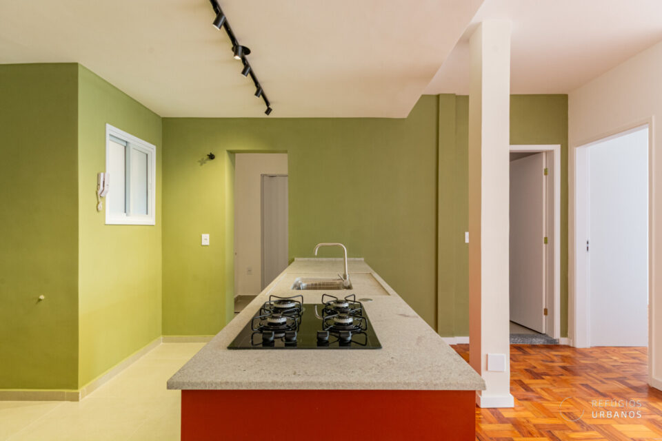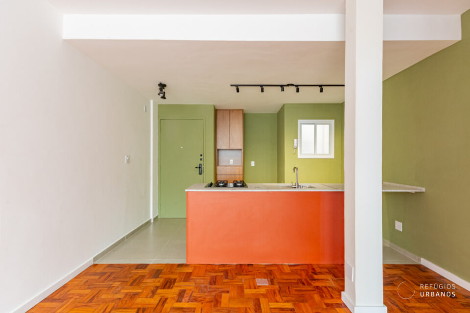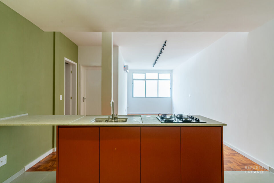 São 65m² de área útil muito bem distribuídos. Logo na entrada, você se depara com a cozinha e sala de estar, que se integram. Esses ambientes conversam por meio do piso de tacos em madeira, restaurado na reforma. Vale ressaltar que a cozinha está equipada com marcenaria e fogão cooktop.
