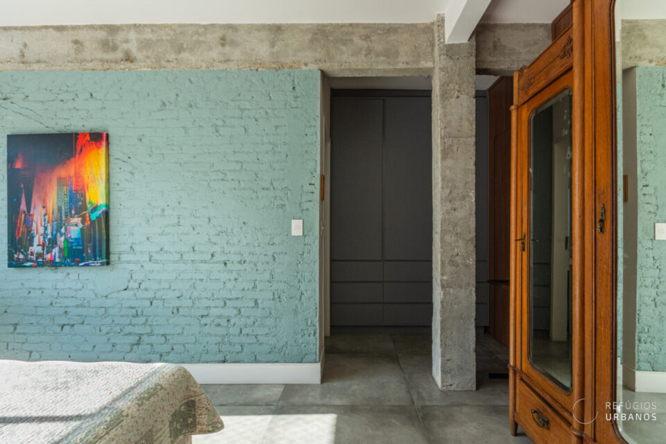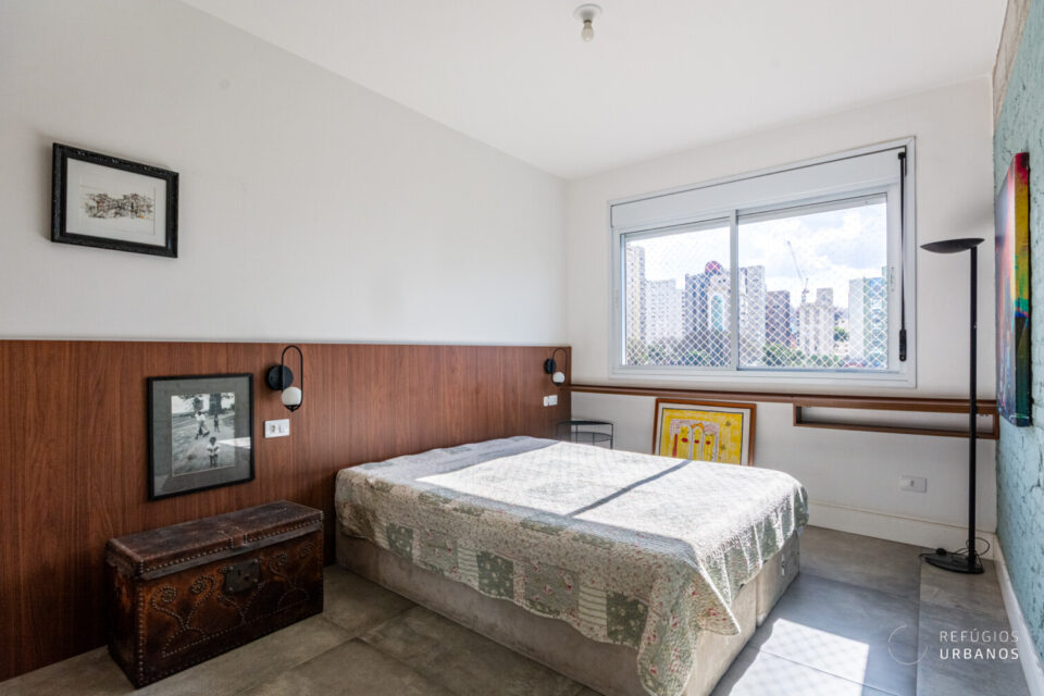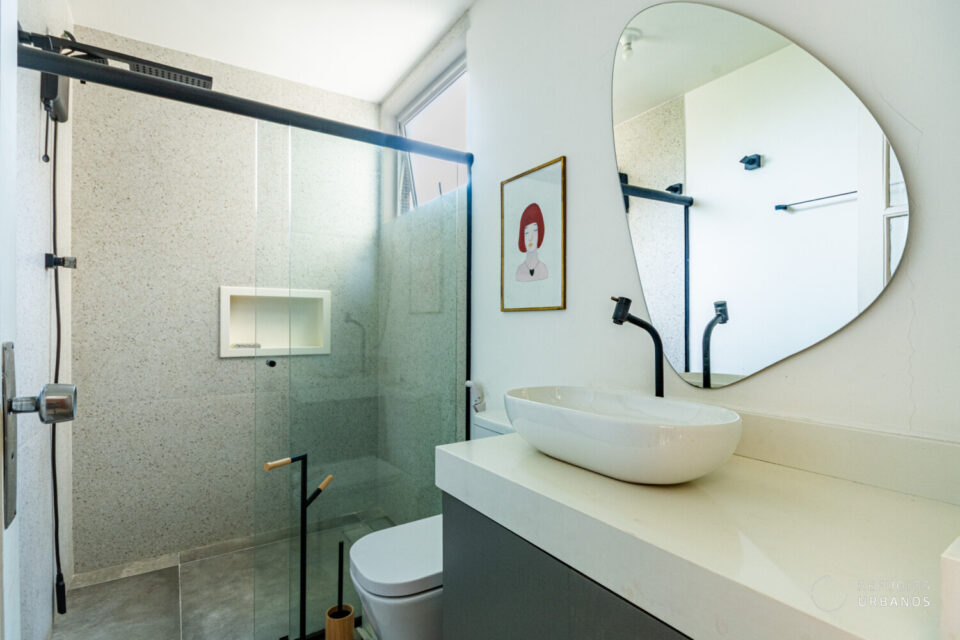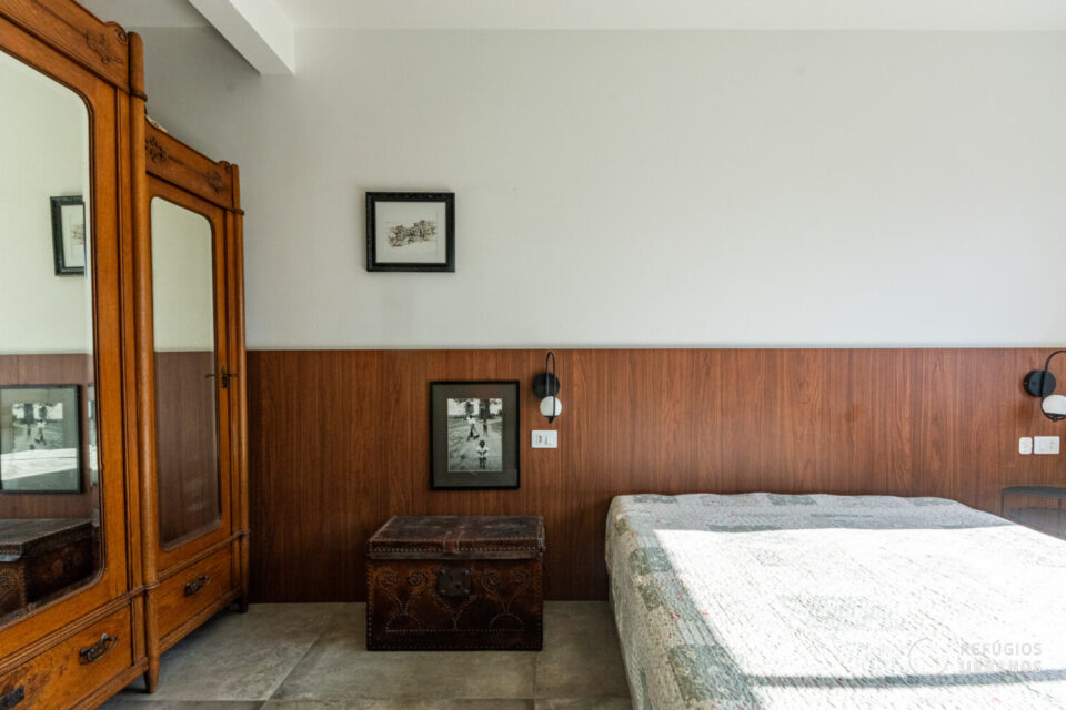 Uma parede inteira de ripados nos leva até a suíte. Assim como na sala, aqui também recebemos todo esse sol gostoso a tarde inteira. Além disso, trata-se de um quarto de bom tamanho, com uma parede inteirinha com armários planejados bem espaçosos e uma prateleira ao lado do janelão super funcional. Finalizando, um banheiro para lá de confortável, com ventilação natural.