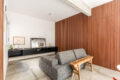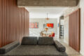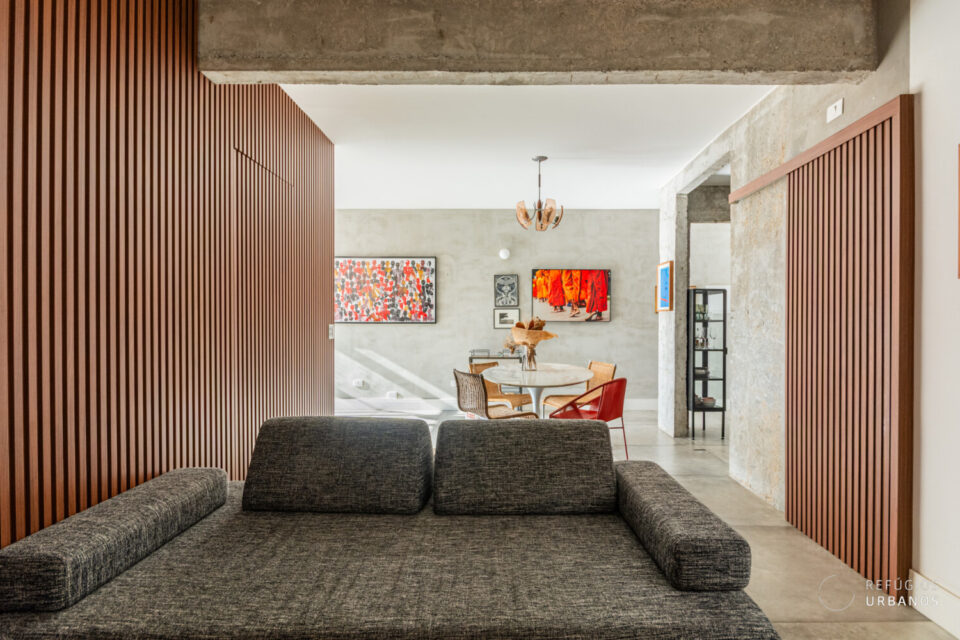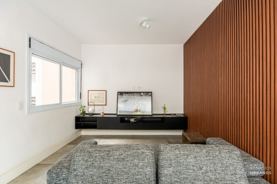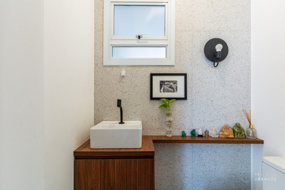 Seguindo adiante, temos uma sala de TV superconfortável e aconchegante, a qual, na planta original, era o segundo quarto. Em seguida, logo ao lado, uma porta em ripados oferece acesso a um lavabo charmoso, o qual atende à área social, proporcionando maior conforto no dia a dia.