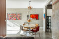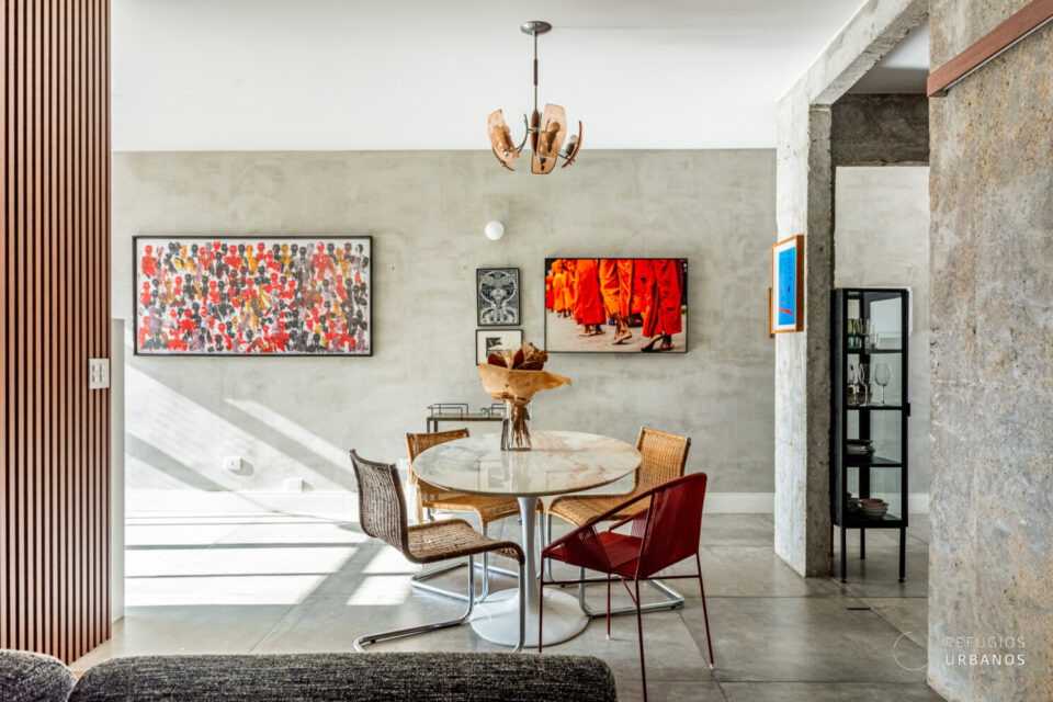 Logo na entrada, se percebe a atmosfera convidativa e calorosa da luz natural, que invade todo o ambiente de sala de jantar e estar, através do janelão quase piso-teto, com vista para a copa das árvores.