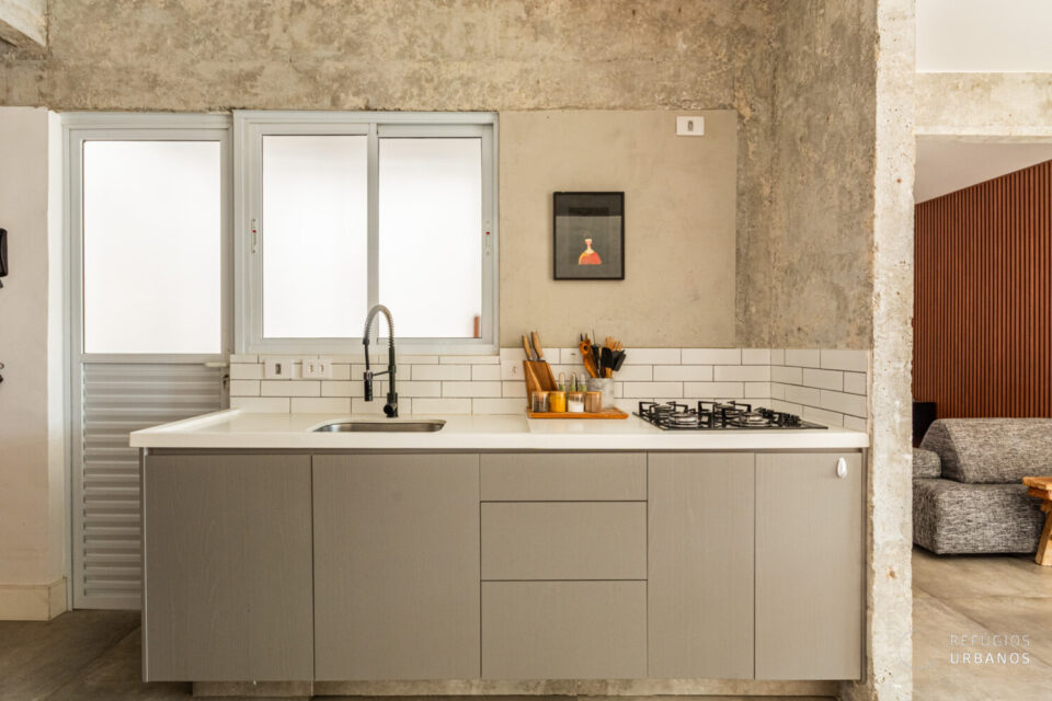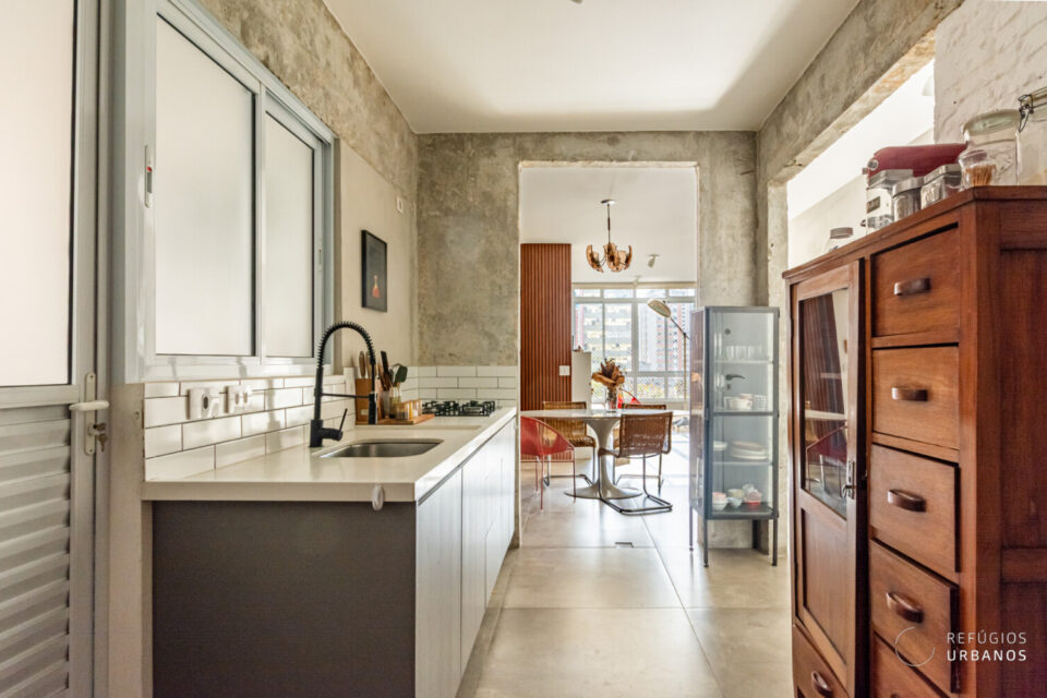 Além disso, a cozinha integra-se de forma fluida e prática. Vale ressaltar que esse ambiente está equipado com marcenaria e eletrodomésticos.