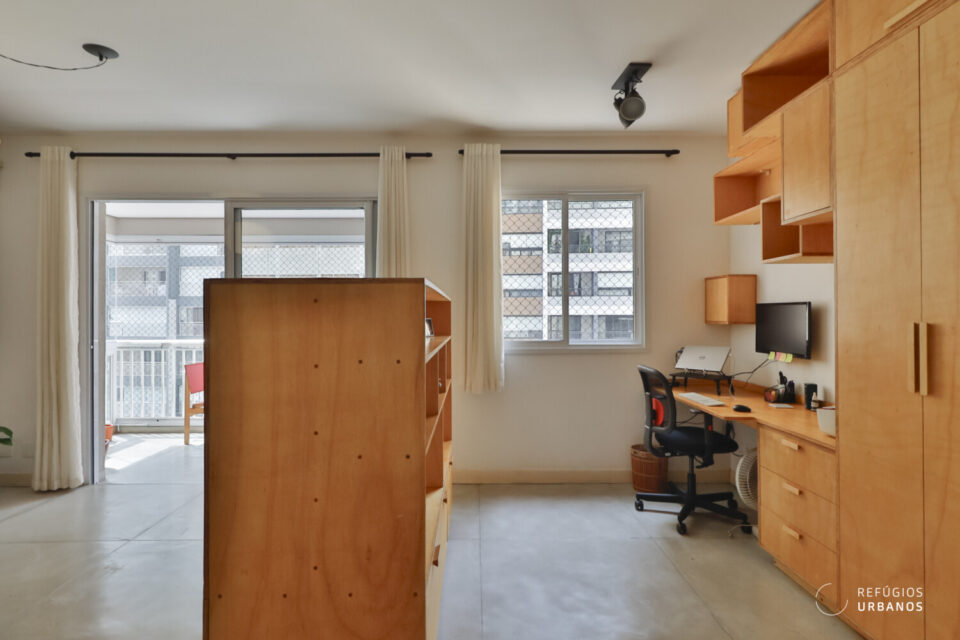 Originalmente, este apartamento tinha dois quartos, a integração do segundo quarto à sala criou um ambiente contínuo; entretanto, a marcenaria delimita sala, espaço de trabalho e cozinha com precisão.