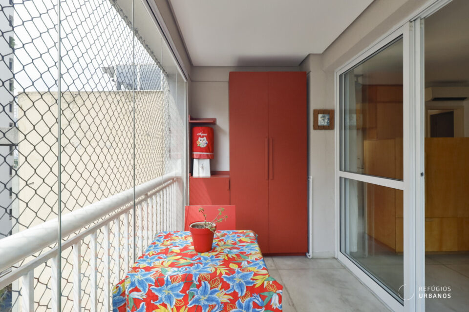 A varanda envidraçada conta com marcenaria para armazenar utensílios de limpeza.