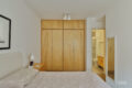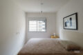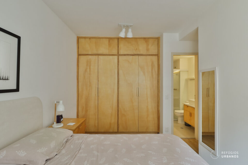 A suíte recebeu uma marcenaria bem pensada e com a mesma estética dos outros móveis, cama queen, piso laminado e as janelas com persianas blackout.