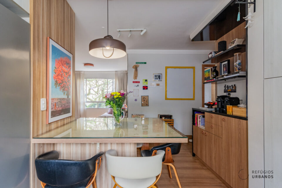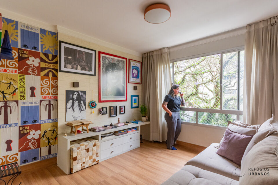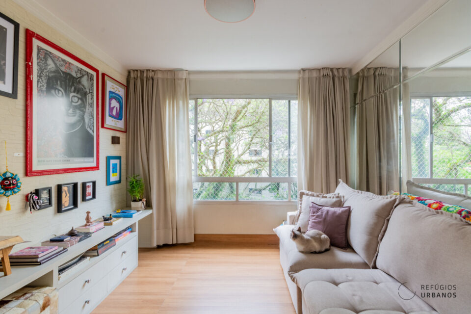 A sala é aquele tipo de ambiente que te convida a desacelerar: tomar um café apreciando as árvores, assistir um filme com conforto ou simplesmente contemplar o movimento lá fora, ou seja, se você busca um lugar para ser um refúgio, acabou de encontrar.