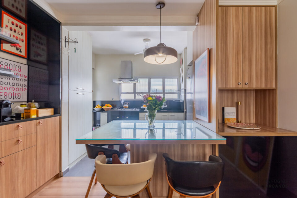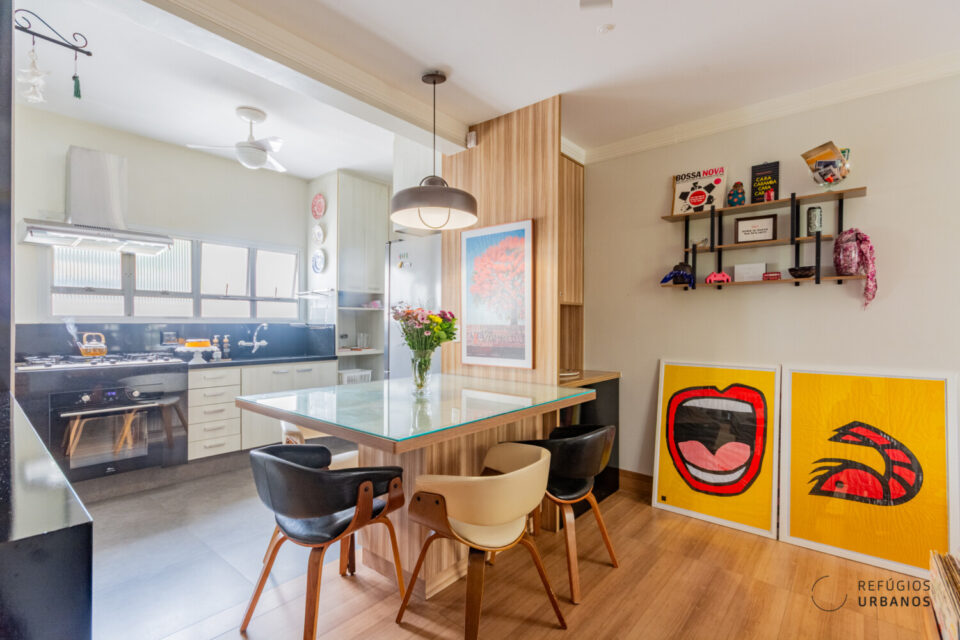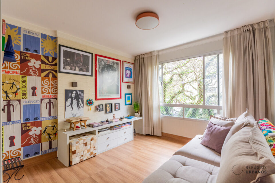 O charme começa já na planta, típica dos anos 70: ambientes amplos, bem distribuídos e iluminados por janelões que trazem a copa das árvores para dentro de casa.