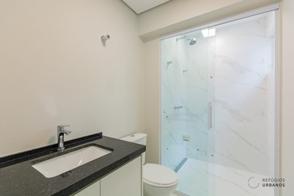 Os banheiros também são neutros e com excelente ventilação natural. Além disso, são confortáveis no espaço.