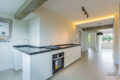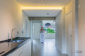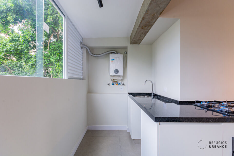 Na cozinha, bancada de granito verde Ubatuba equipada com cooktop, forno e com marcenaria instalada sob a bancada, bem como, área de serviço que segue essa mesma composição.