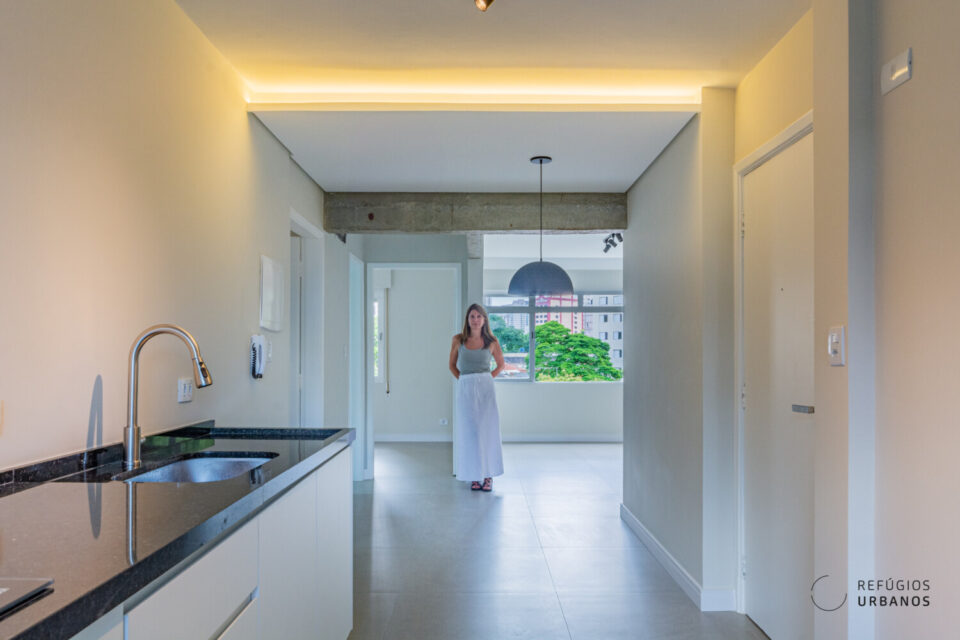 A sala e cozinha foram integradas para dar fluidez e amplitude aos espaços. Colunas de concreto foram descascada para trazer um ar moderno e delimitar os espaços.