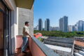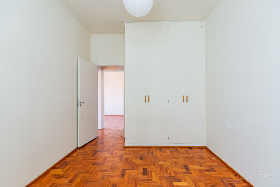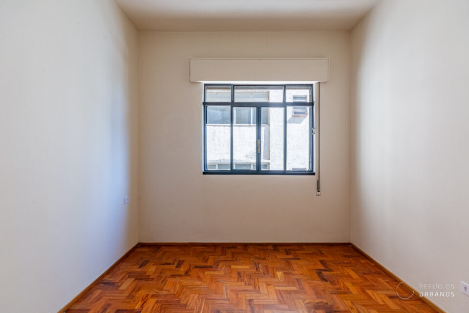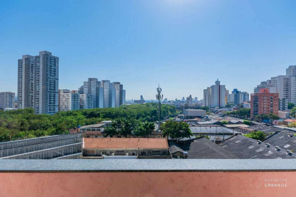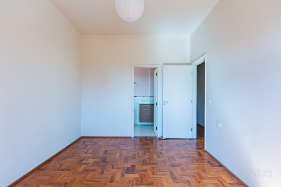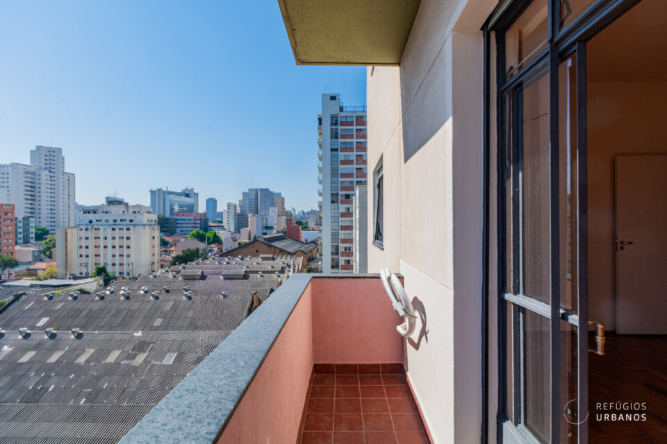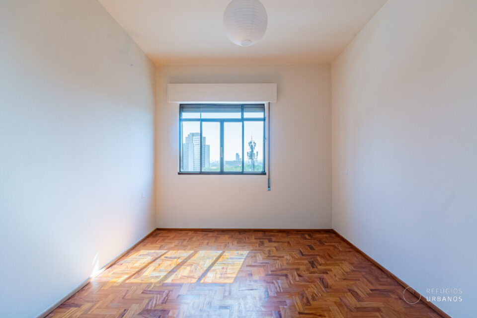 O terceiro dormitório é a cereja do bolo. Ele tem acesso a uma varanda ensolarada e uma vista livre para a vegetação que acompanha o trilho do trem — um cenário verde que traz um ar de refúgio dentro da cidade.
