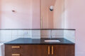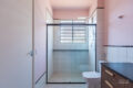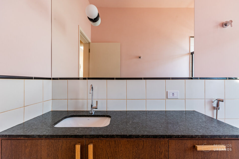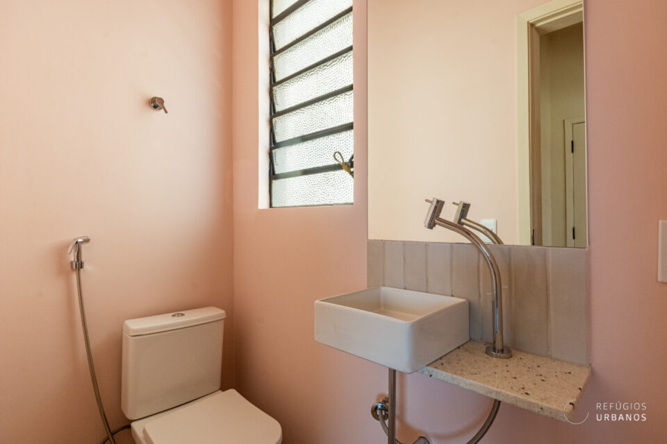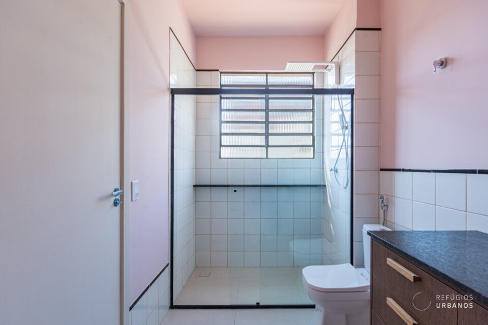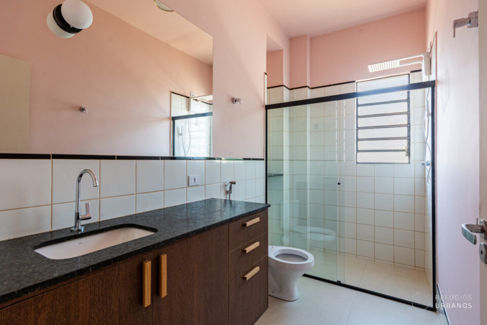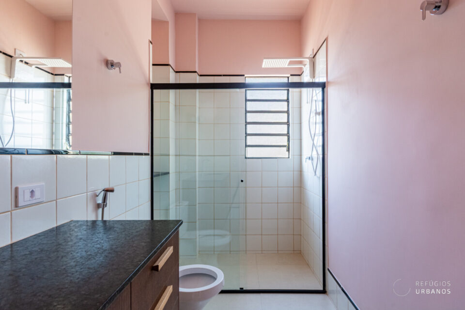 Os proprietários reformaram com atenção aos detalhes os dois banheiros, social e da suíte. Além disso, o tom rosado dos revestimentos cria um contraste harmonioso com o mármore preto, resultando em um visual elegante e aconchegante.