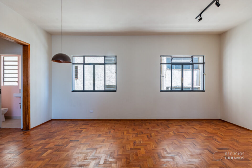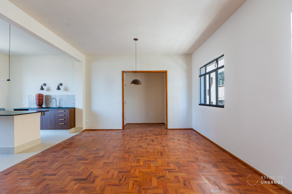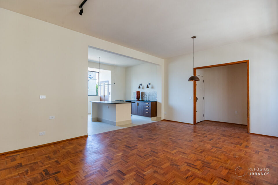 Logo na entrada, o piso de madeira restaurado já entrega o clima acolhedor deste apê. A iluminação natural e a ventilação cruzada completam o cenário, deixando tudo leve e agradável.