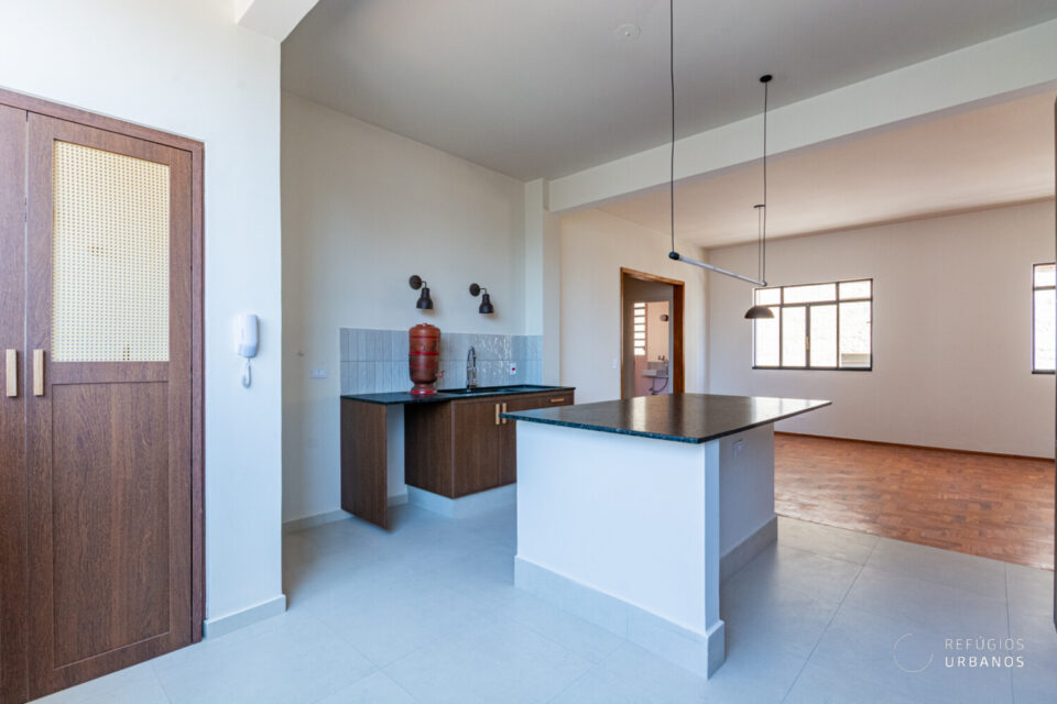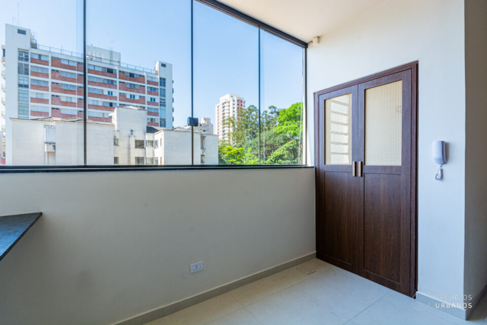 Discretamente escondida sob uma das portas, há uma compacta área de serviço com tanque e espaço para lava e seca. Além disso, o apartamento conta com uma pequena área gourmet, perfeita para instalar uma churrasqueira e aproveitar bons momentos entre amigos.