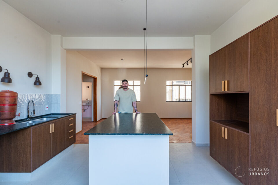 A sala, com 25,64m², foi integrada à cozinha, o que ampliou a sensação de espaço e trouxe ainda mais luz. Uma ilha divide os ambientes de forma sutil, ideal para quem gosta de cozinhar e conversar ao mesmo tempo. A marcenaria sob medida é um charme à parte, com acabamento caprichado e puxadores que se destacam pelo contraste elegante.
