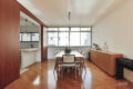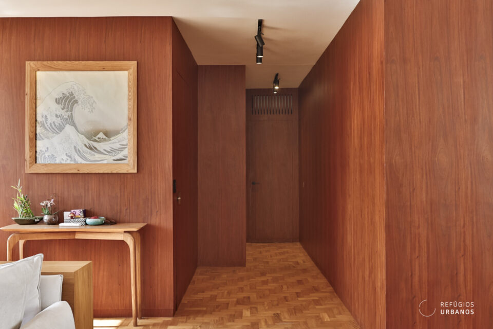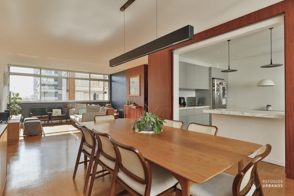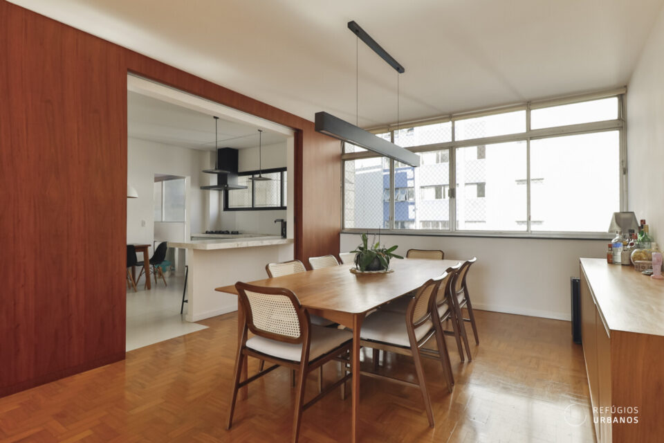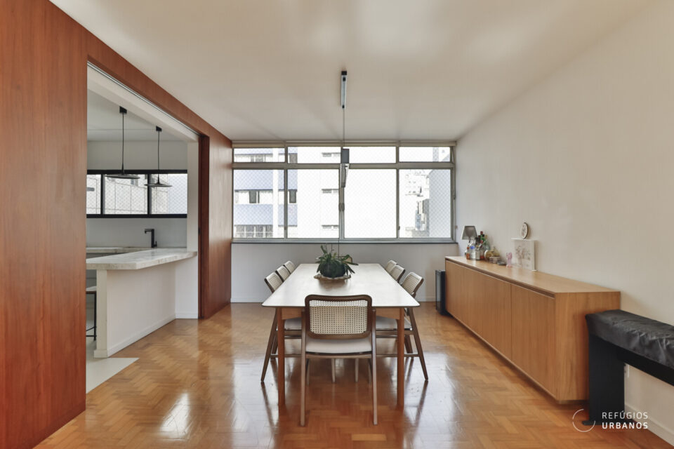 Totalmente reformado, ele preserva o charme original com piso de taco restaurado, que, desse modo, soma ao projeto contemporâneo de integração dos ambientes.