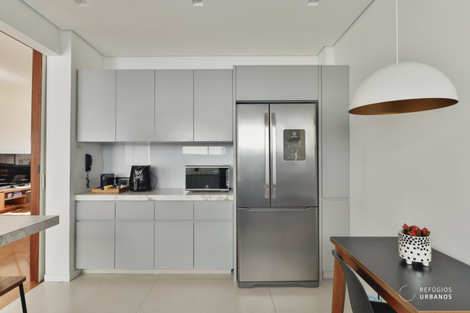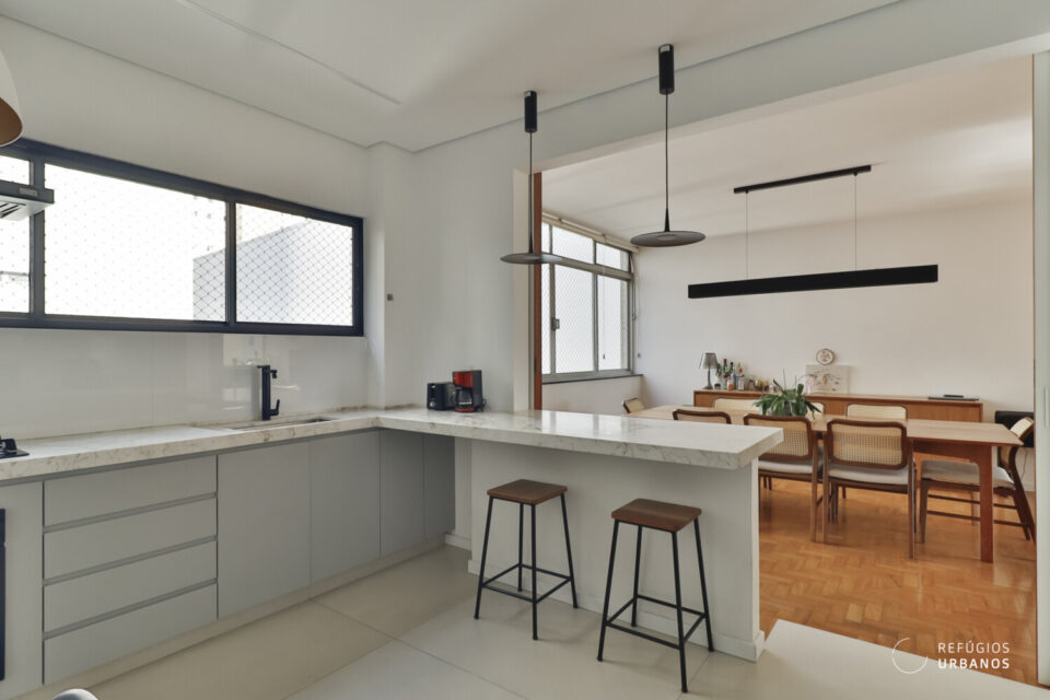 A cozinha se abre para a sala de jantar, criando assim, um espaço fluido e acolhedor — perfeito para receber amigos ou simplesmente aproveitar o dia a dia com mais leveza.