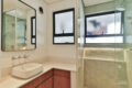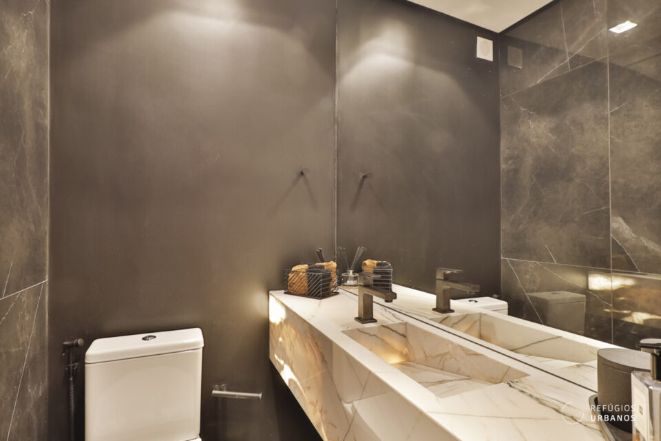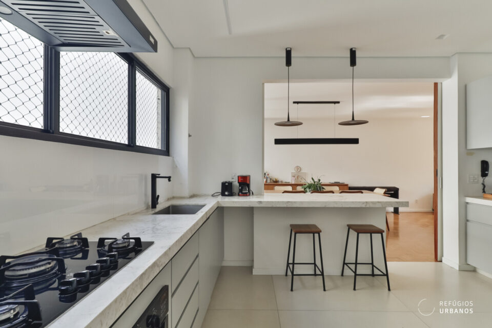 - Bancada de mármore para refeições rápidas na cozinha, que também é repleta de armários.