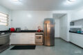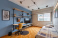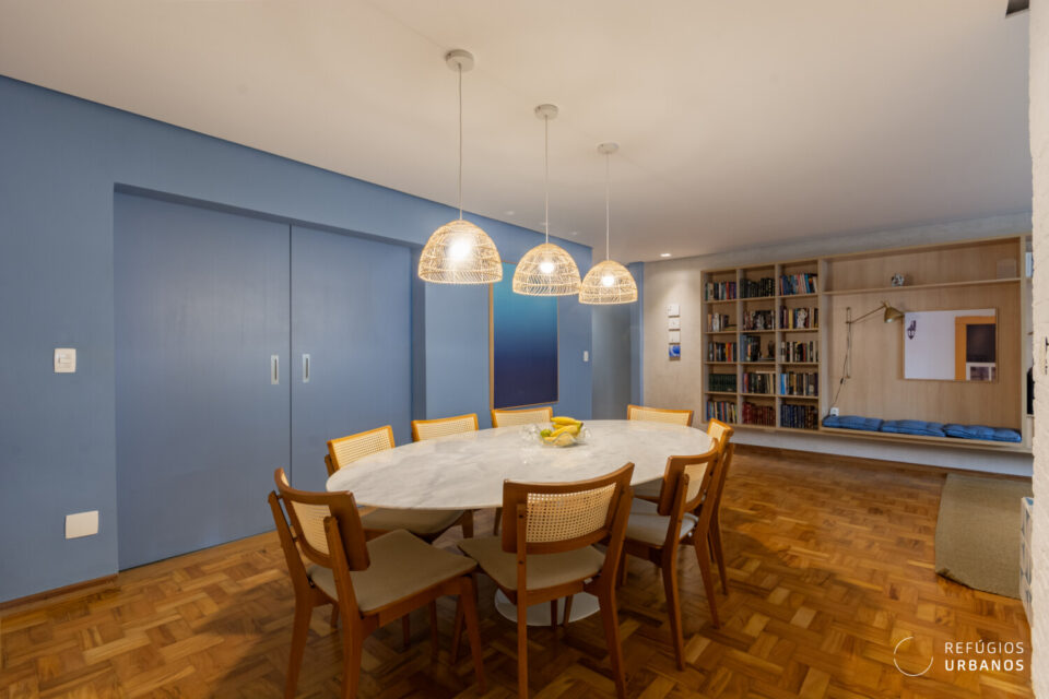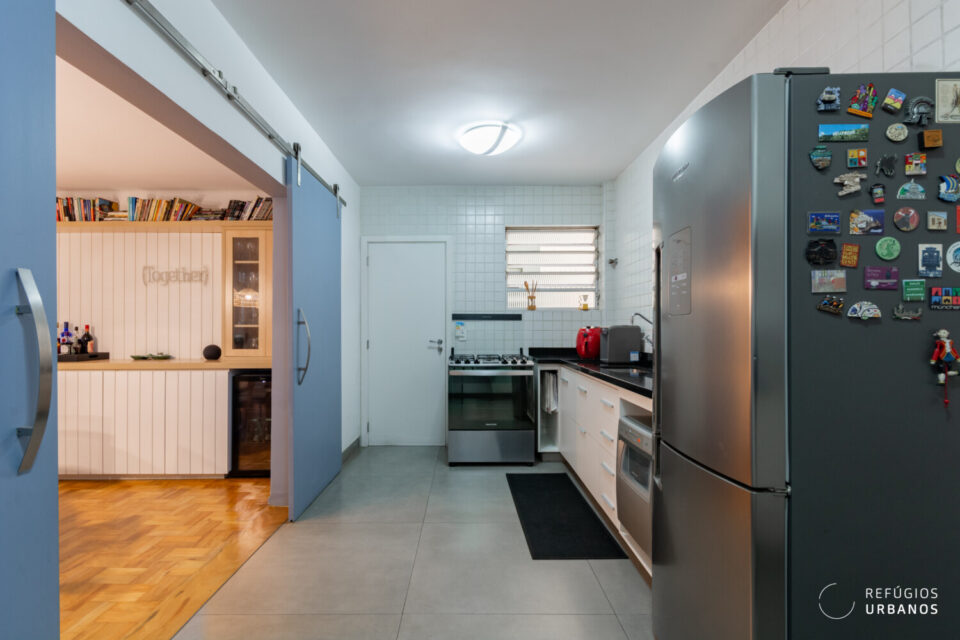 Na área social, por sua vez, a cozinha também surpreende. Ela conta com uma porta de correr que permite integrar totalmente com a sala. Ao mesmo tempo, quando você quiser, é possível fechar e separar os ambientes com elegância. E sim: com belas portas azuis que trazem personalidade ao espaço.