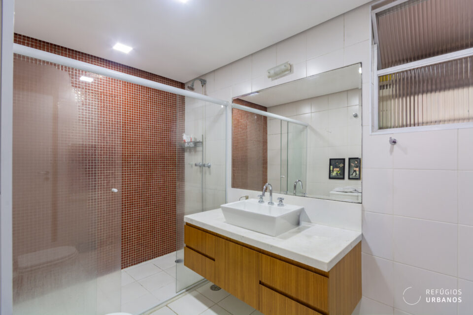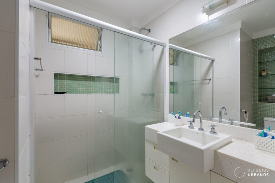 E tem mais um detalhe importante (e raro): todos os banheiros possuem ventilação natural. Na suíte, inclusive, há um roupeiro integrado com cesto de roupa suja — daquelas soluções que deixam a rotina mais prática e bem resolvida.