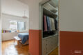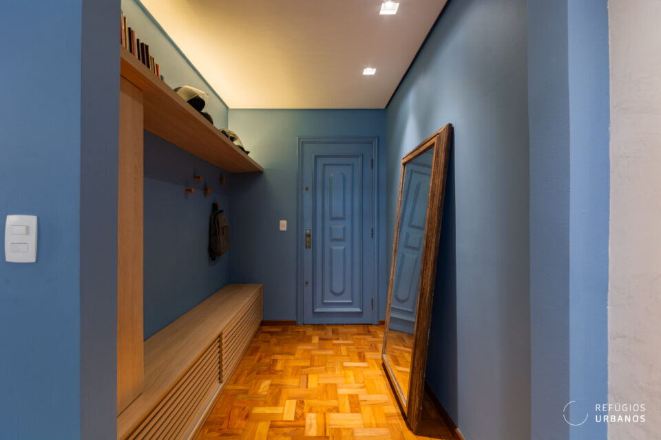 Antes mesmo de chegar aos quartos, o apartamento já revela um detalhe muito inteligente: há duas portas separando a sala do corredor.