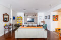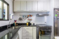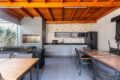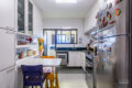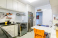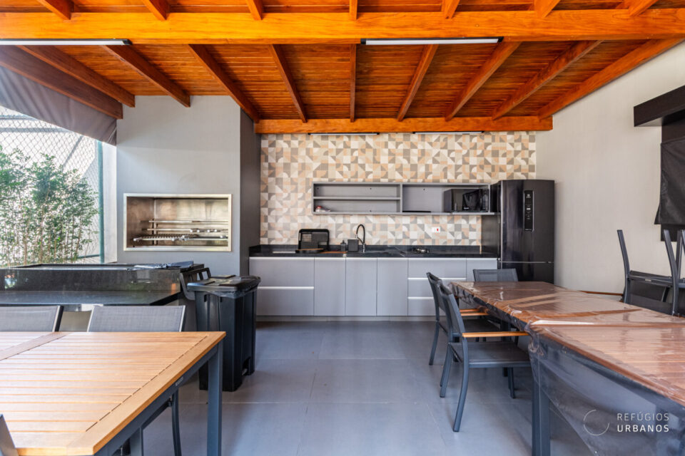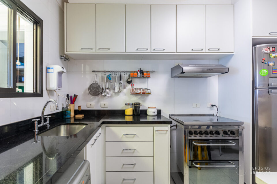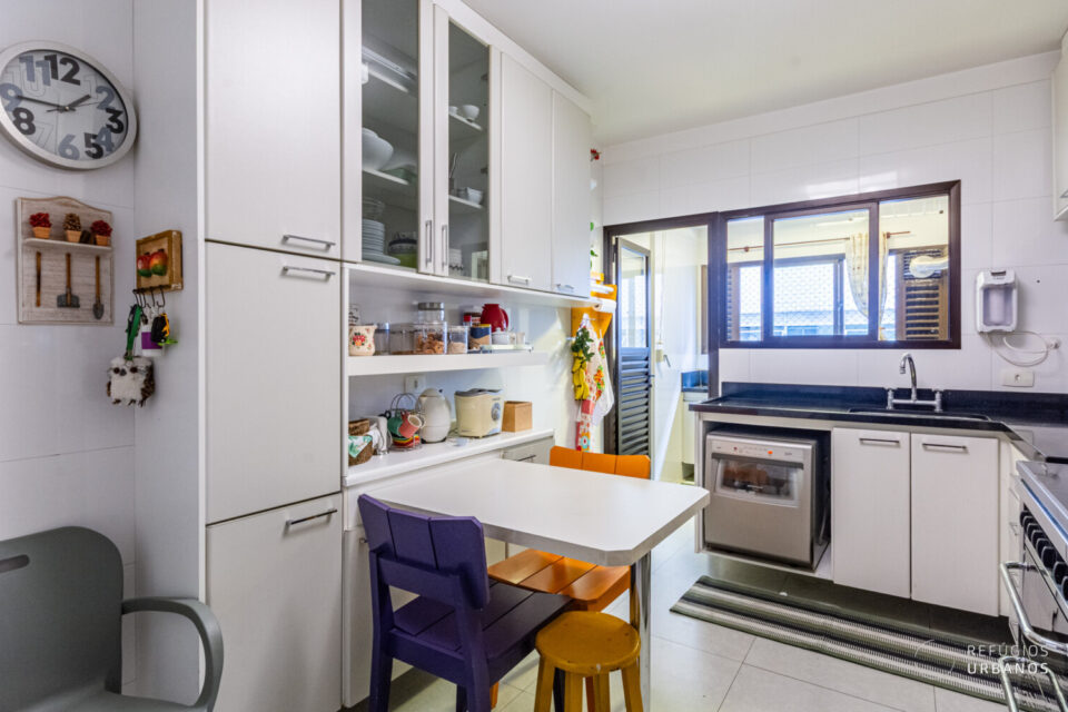 A cozinha é grande e comporta uma mesa para o dia a dia. Está equipada com marcenaria planejada e com espaço de sobra para os eletrodomésticos. Em suma, é ideal para quem precisa de uma rotina prática.