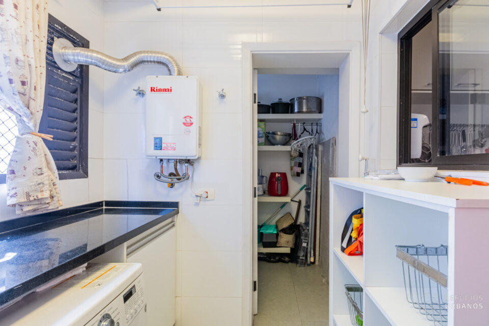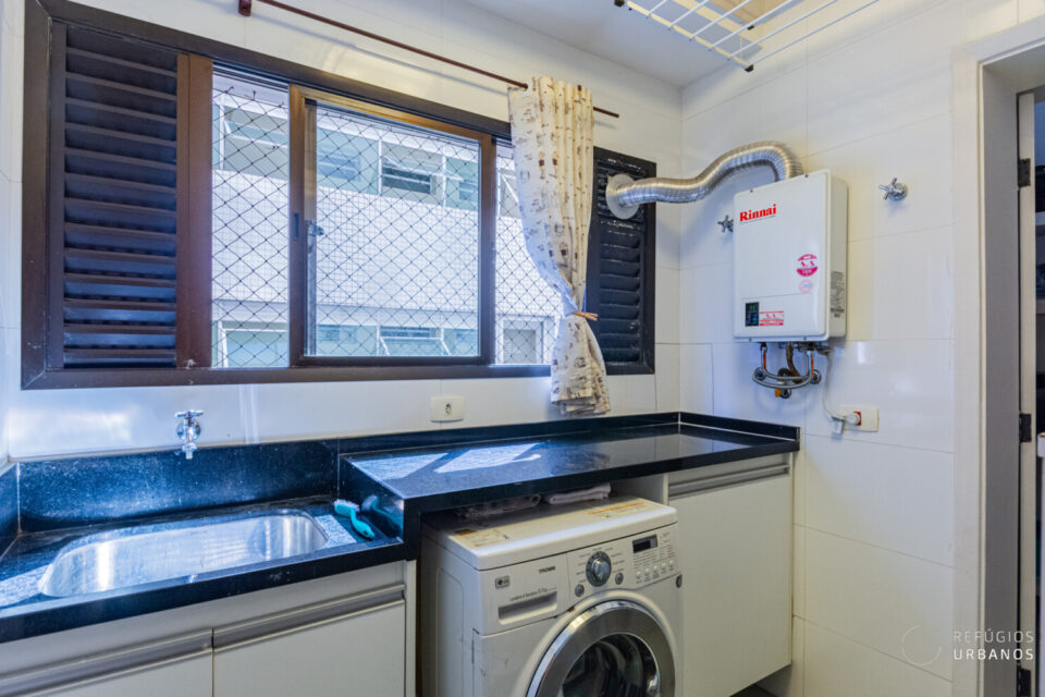 A lavanderia, ampla e ventilada por um janelão, possui uma bancada e marcenaria funcional.