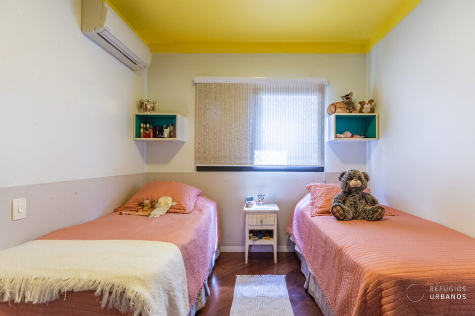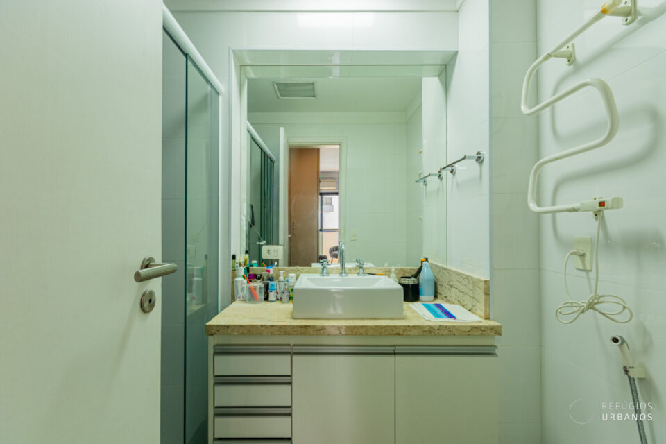 Um banheiro social completo atende os dois quartos, e um deles, assim como a suíte, possui uma varanda interligada, perfeita para momentos de relaxamento.