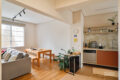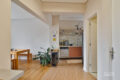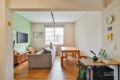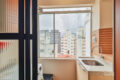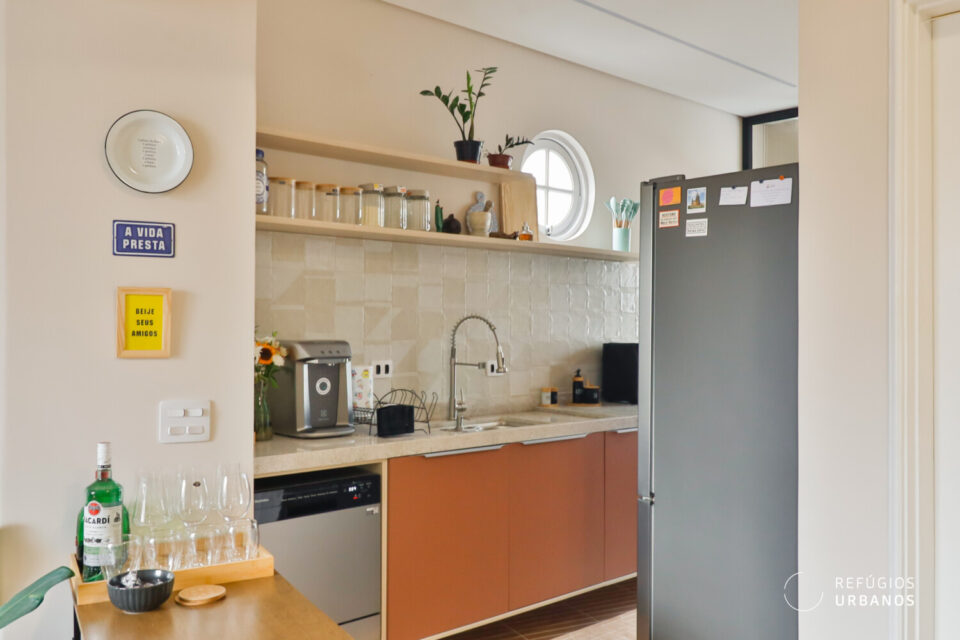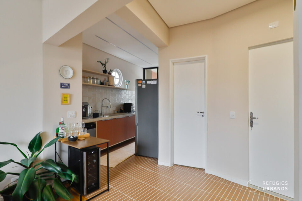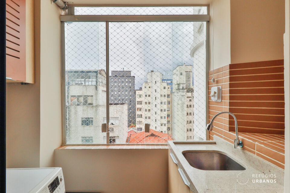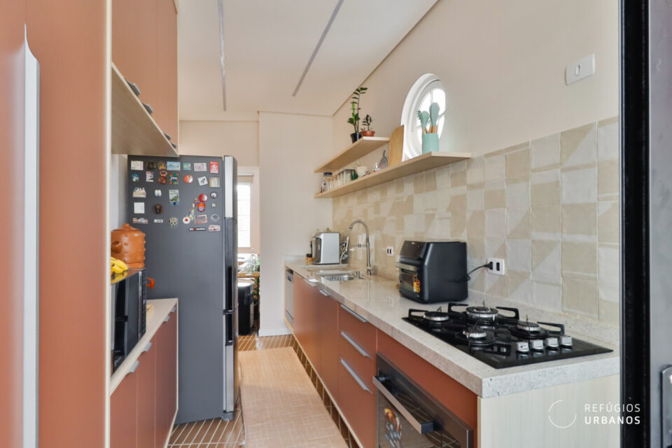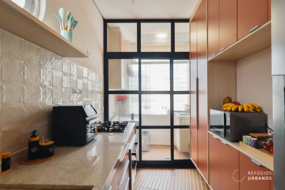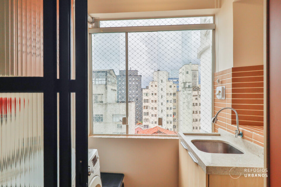 A marcenaria, executada com refinamento, une sala e cozinha em uma leitura contínua e harmoniosa. Cada detalhe trabalha para que os ambientes se complementem sem se confundir. Ao fundo da cozinha, a área de serviço ocupa uma posição discreta, de frente para os fundos do prédio, funcional e bem resolvida. O aquecimento é a gás: a água quente chega na hora certa, sem espera, como deve ser.