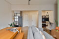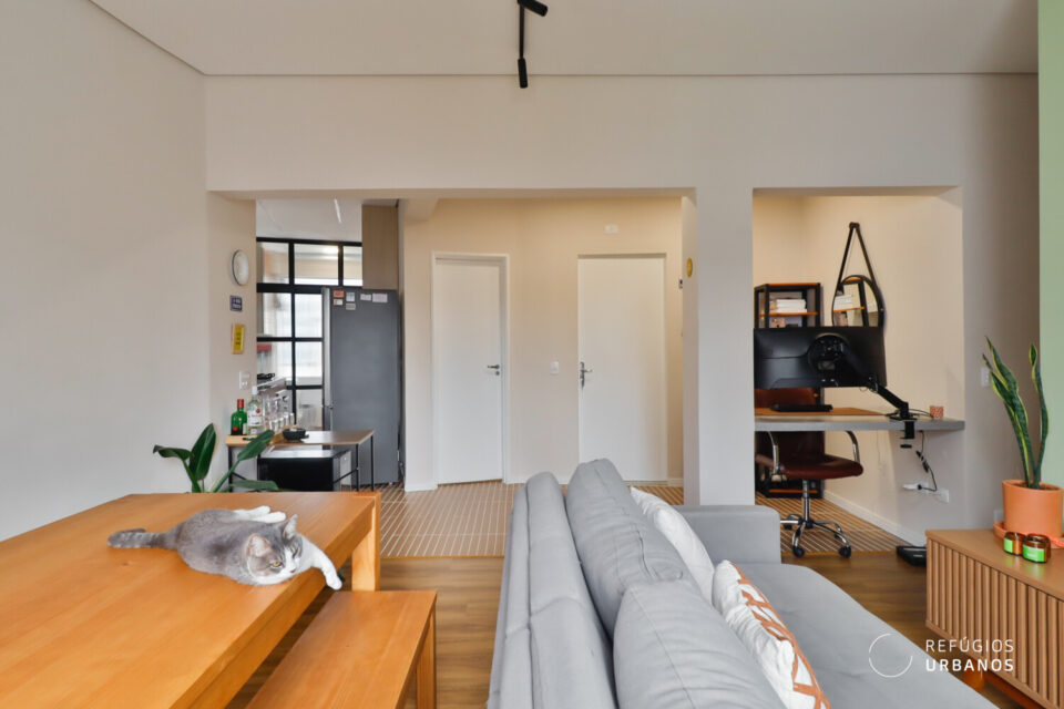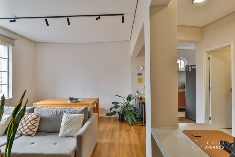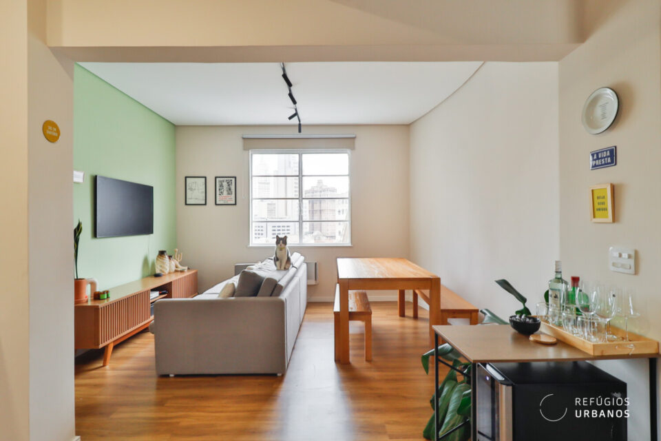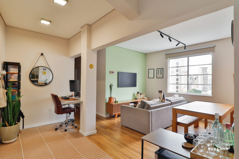 Ao atravessar a porta, um janelão recebe o visitante com o centro de São Paulo enquadrado como uma obra de arte. A sala, generosa em luz natural, abraça a vida contemporânea: além da área de convivência, um espaço de home office se integra com naturalidade ao ambiente.