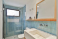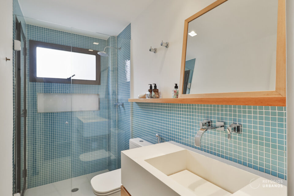 Seguindo adiante, temos o banheiro social com detalhes em azul com quartzo branco e madeira, que são uma graça.