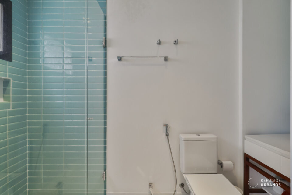 Seguindo a decoração clean da reforma, temos o banheiro, que é amplo e ventilado.