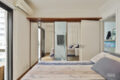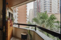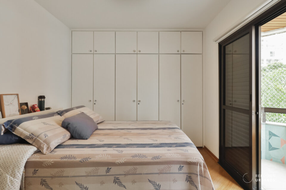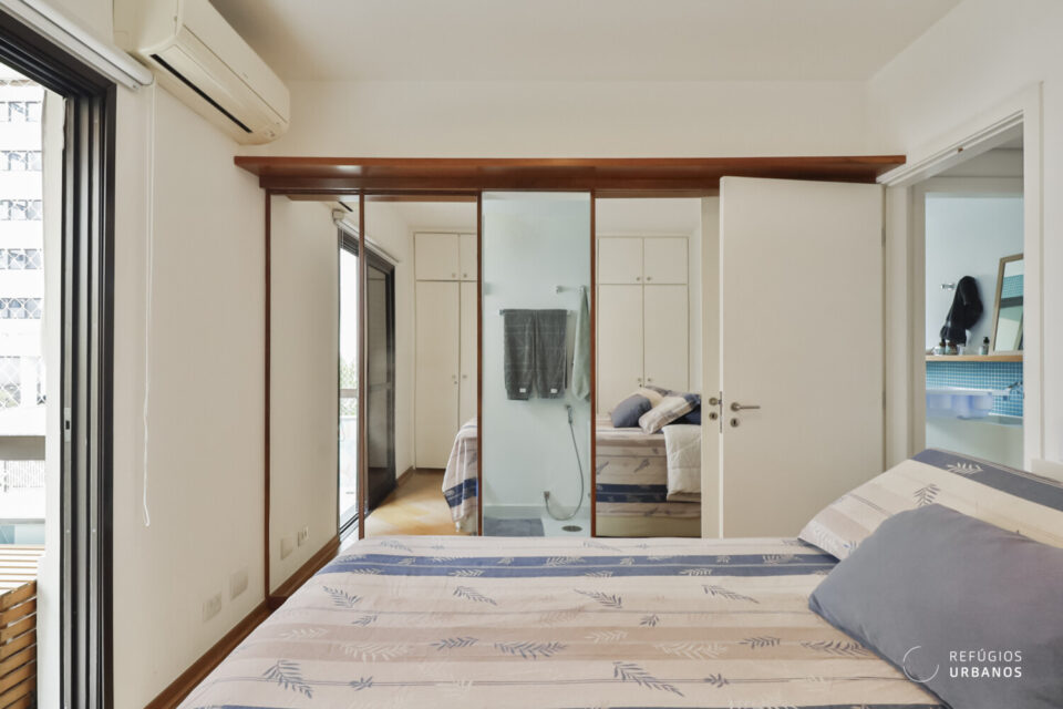 Na suíte, a porta de correr espelhada reflete a luz natural que vem de fora. Uma outra varanda nos recebe em clima de sossego, depois da rotina de trabalho.