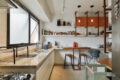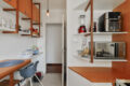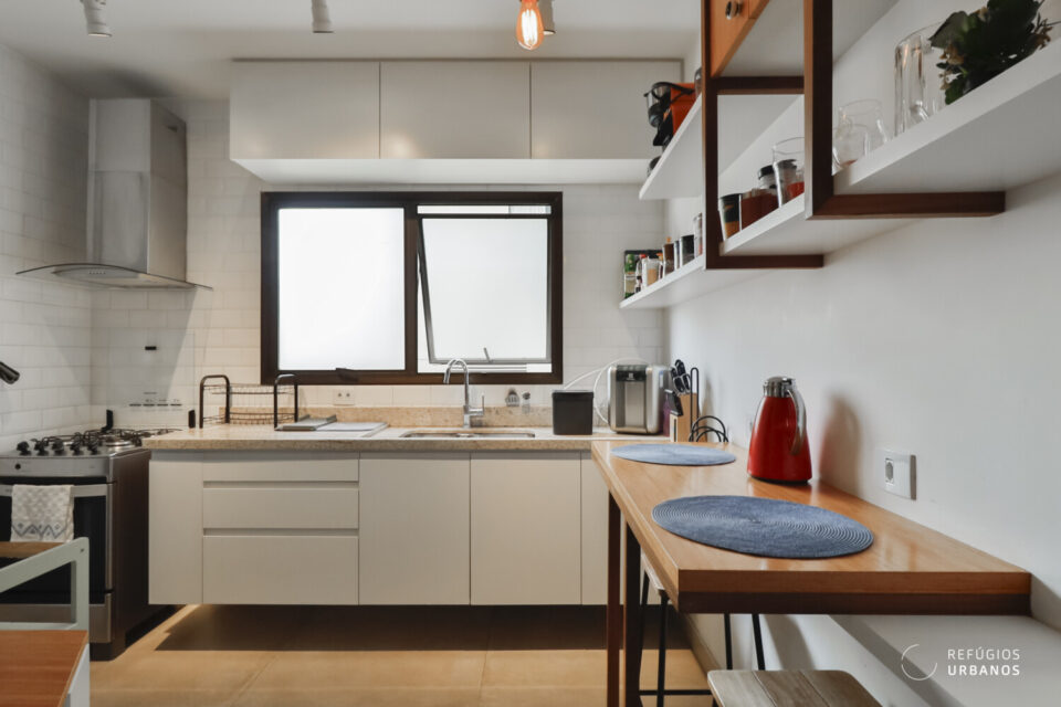 A cozinha, que também passou por reforma e segue as estantes da sala, além dos armários. Um detalhe legal desse ambiente é a presença de uma janela, além de também contar com uma copa para refeições rápidas.