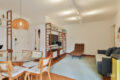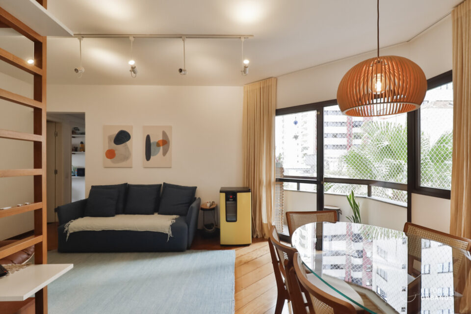 Logo ao entrar, temos o living confortável com dois ambientes e piso de madeira, assim como as estantes, que são as protagonistas do projeto, tanto no estar como na sala de jantar.